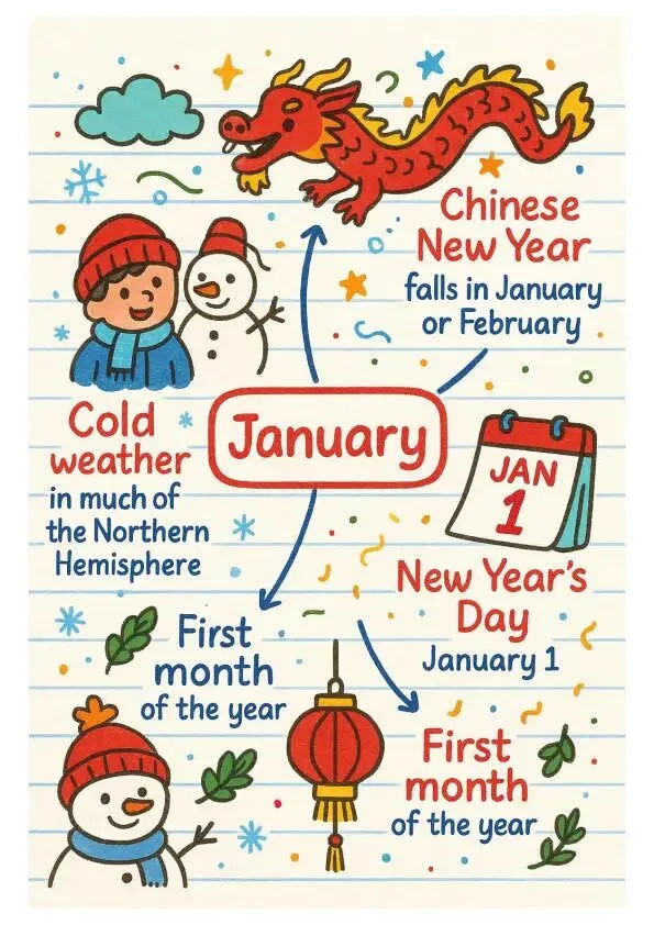 January:结合 “中国新年(Chinese New Year)”“元旦(New Year’s Day)”,搭配舞龙、雪人插画,北方冬季的 “Cold weather” 也成了记忆锚点。