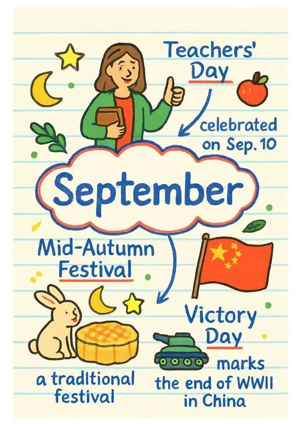 September:教师节(Teachers’ Day)、中秋节(Mid-Autumn Festival)、齐上阵,“秋叶变色” 的季节特点更让单词和生活场景联动。