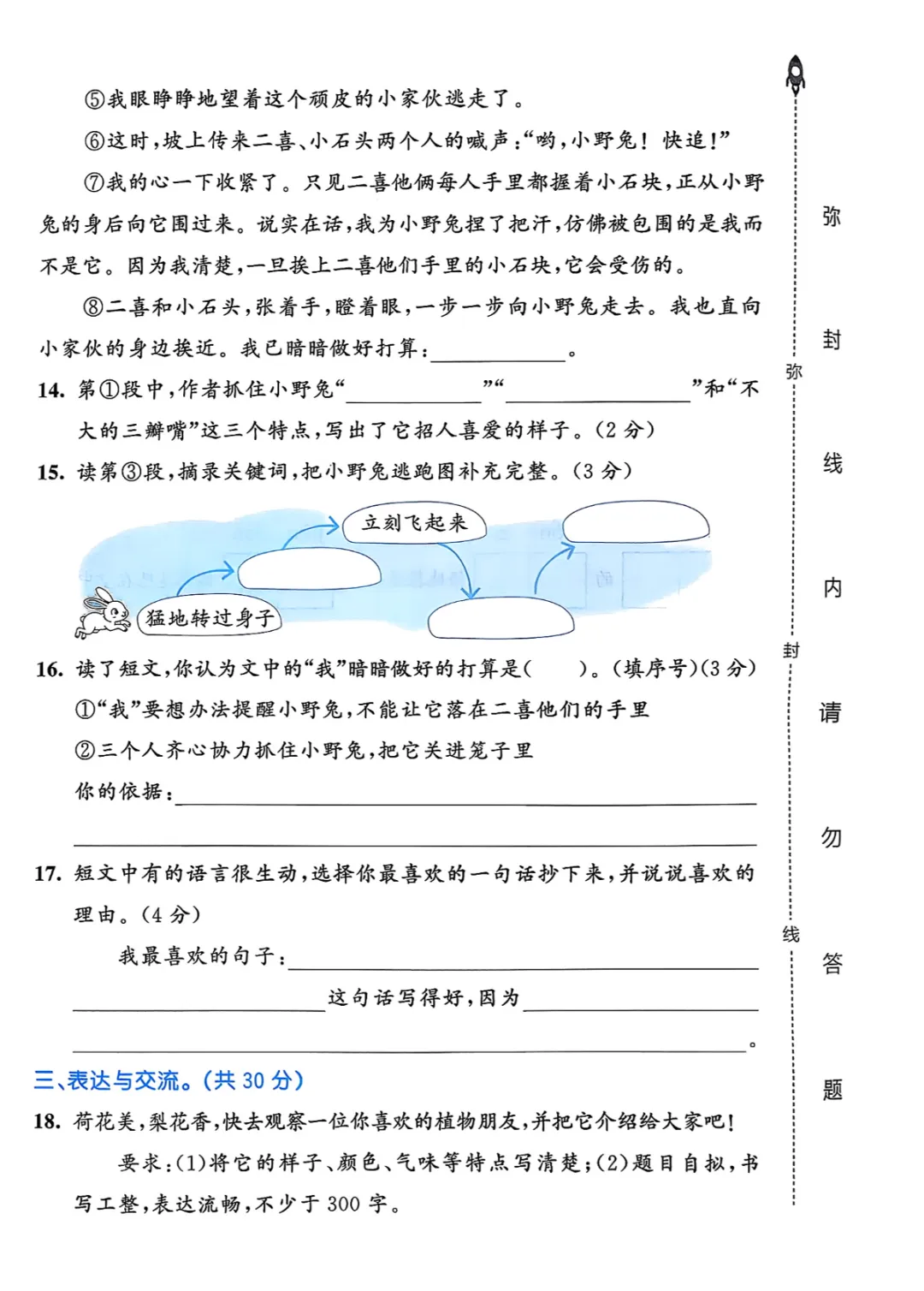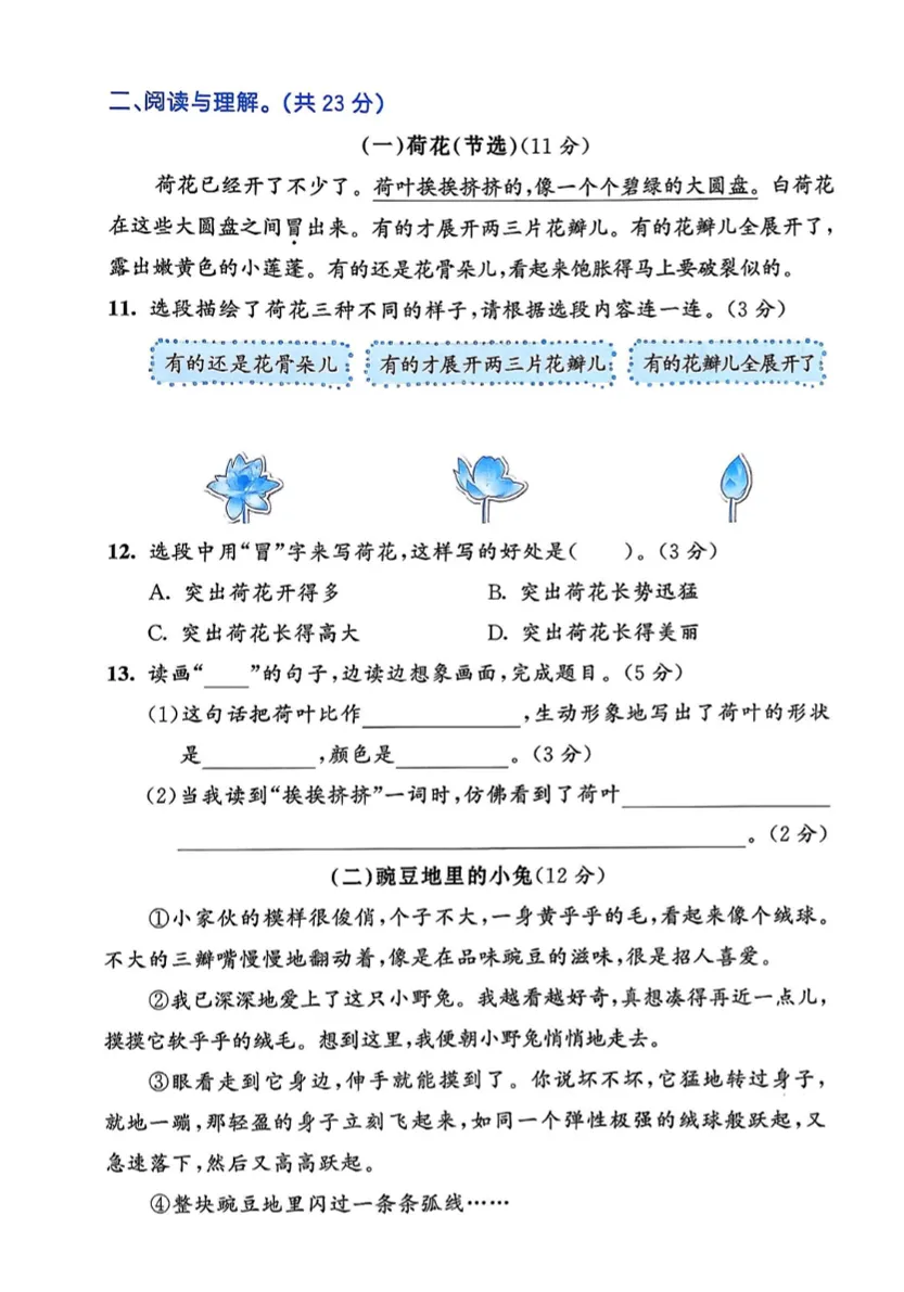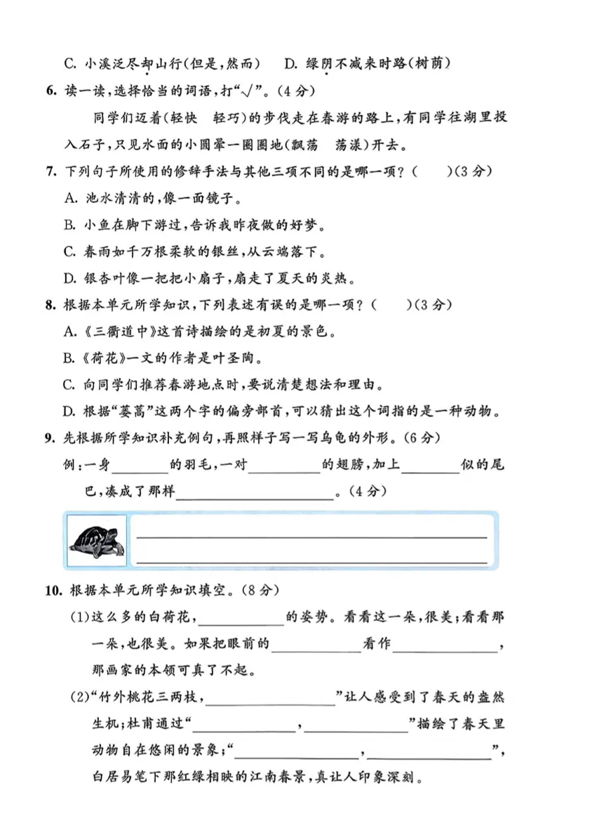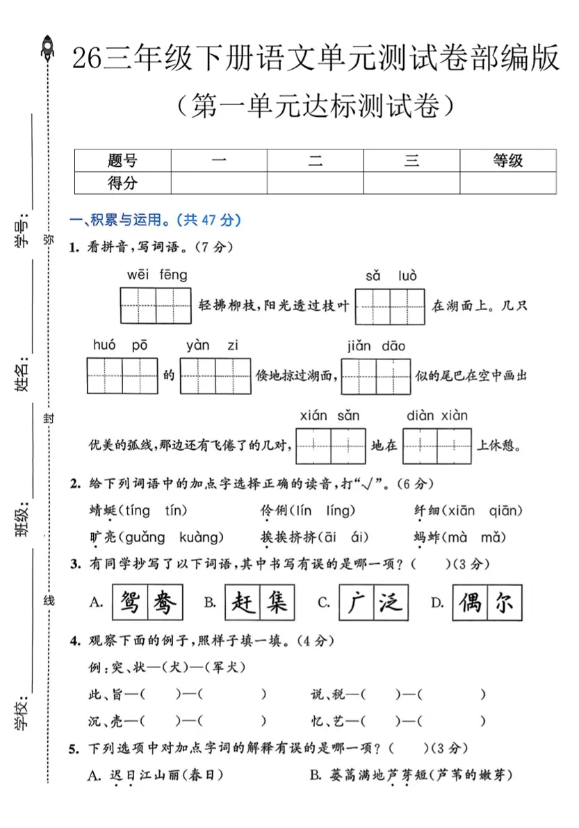 【免费下载】三年级(下)语文 第一单元达标测试卷《部编版》,PDF电子版,可打印