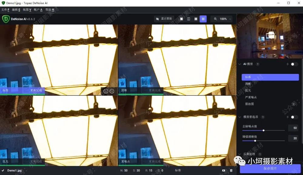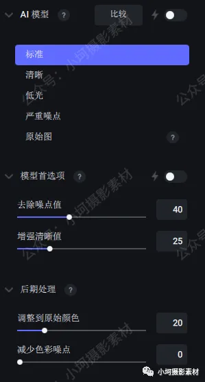 含5种AI降噪模式:标准、清楚、低光、高噪点、RAW