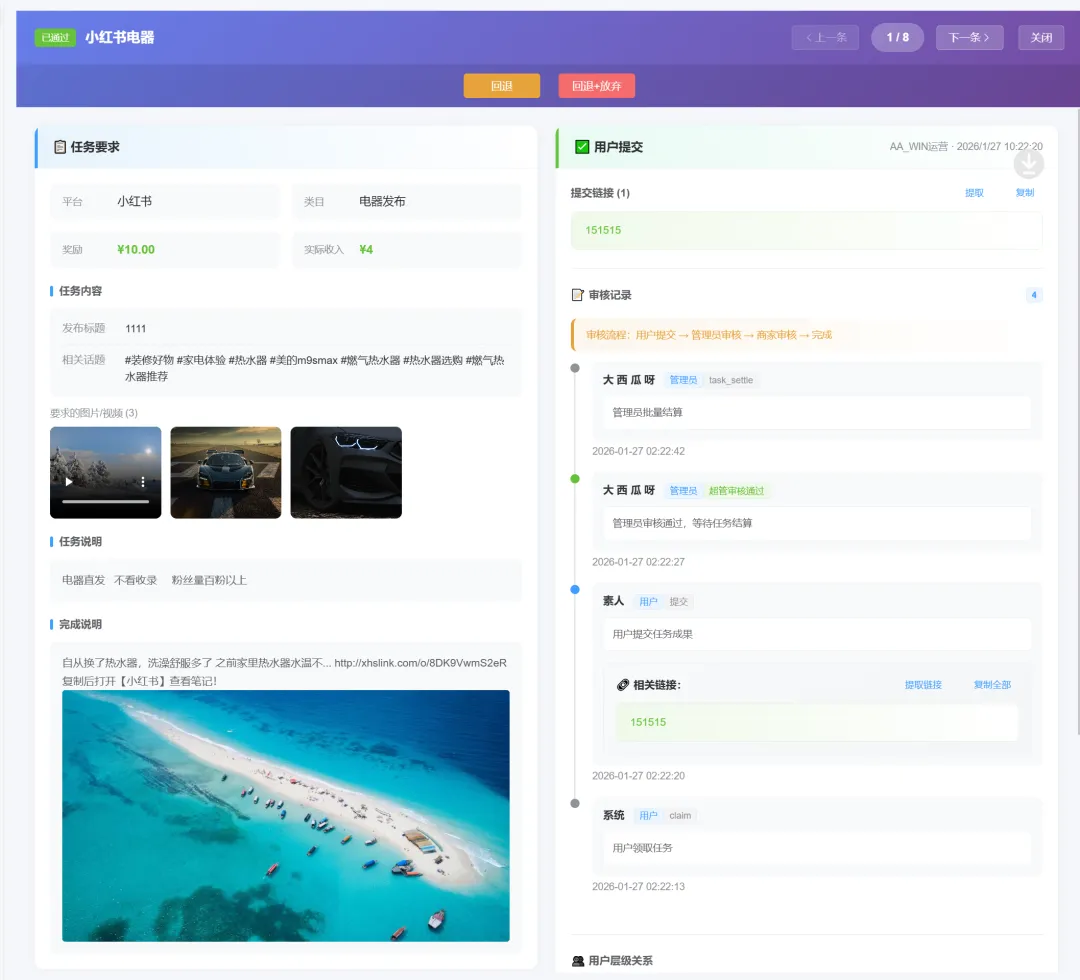 ·核心数据,清晰呈现: 任务总利润、各层级代理分润金额、支付给素人的总佣金、任务完成率、参与用户列表及详情等核心数据,以图表和列表形式直观展示。📊📈