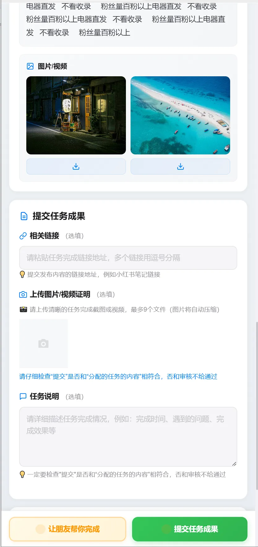 ·要求清晰: 详细展示任务的具体要求、步骤说明、所需素材(文字、图片、链接等一键下载/复制)、提交规范(如需要提交的截图、链接等)。📋✅