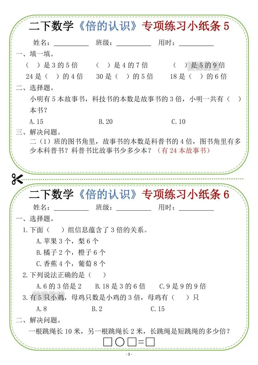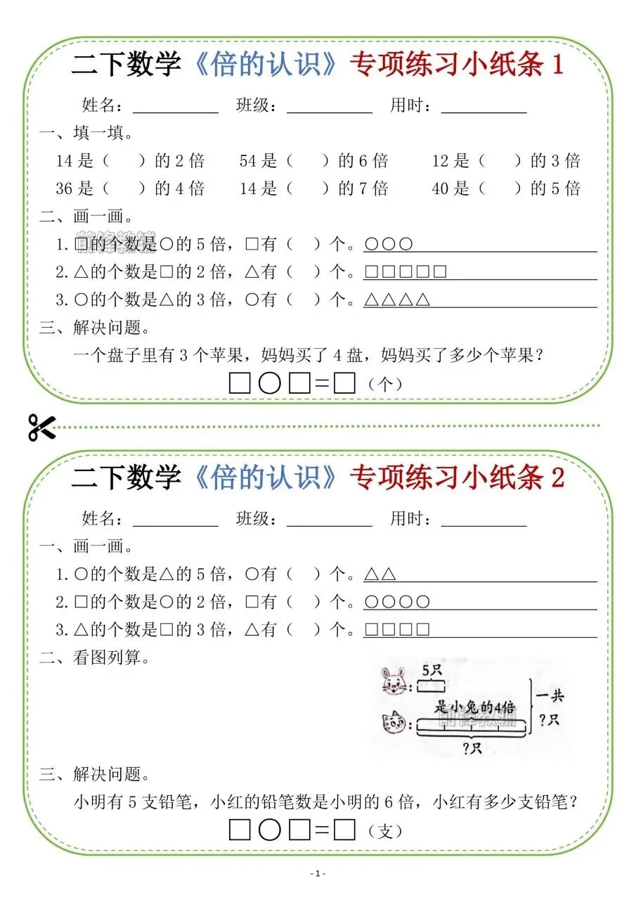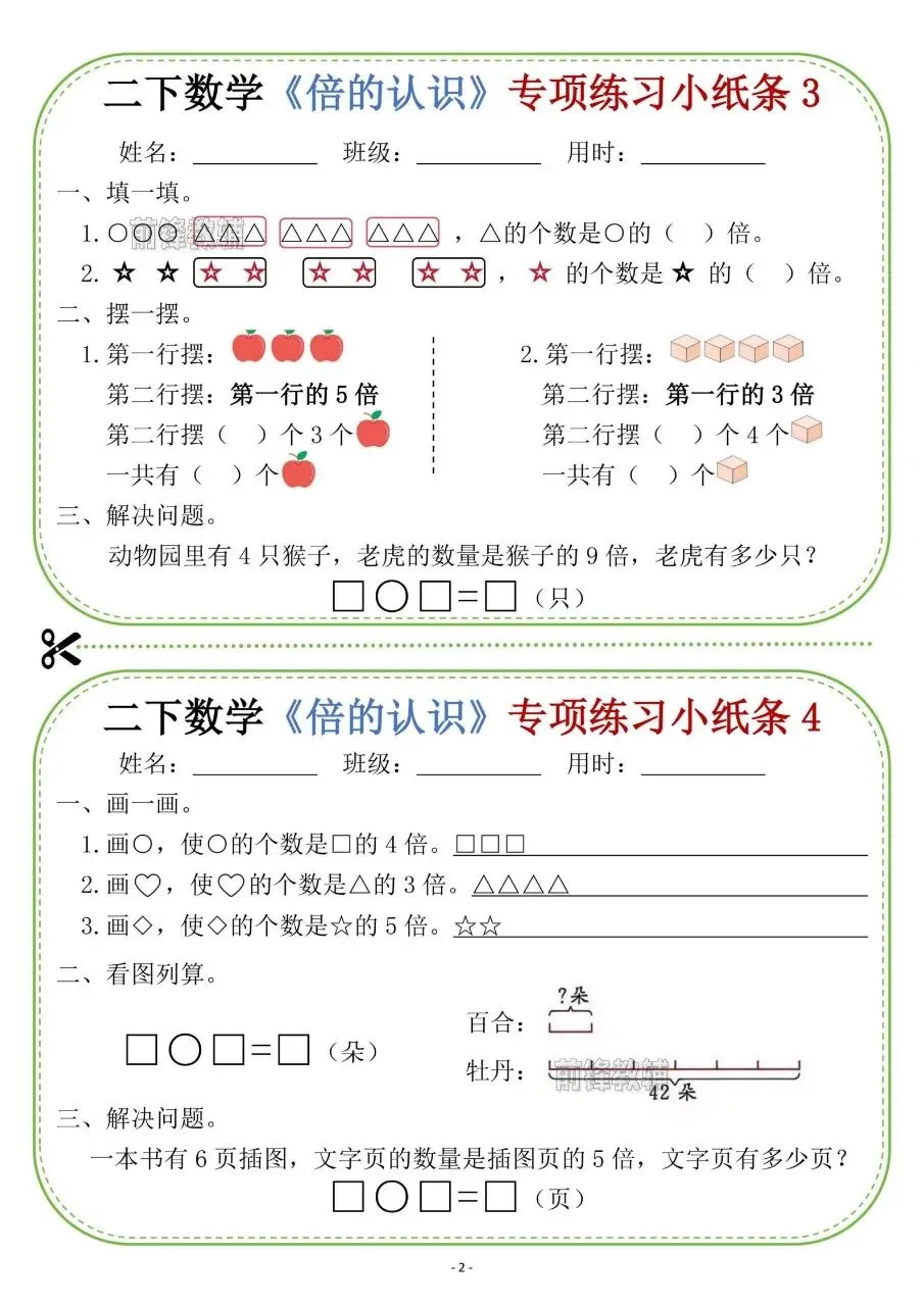 二下数学《倍的认识》专项练习小纸条电子版免费下载!