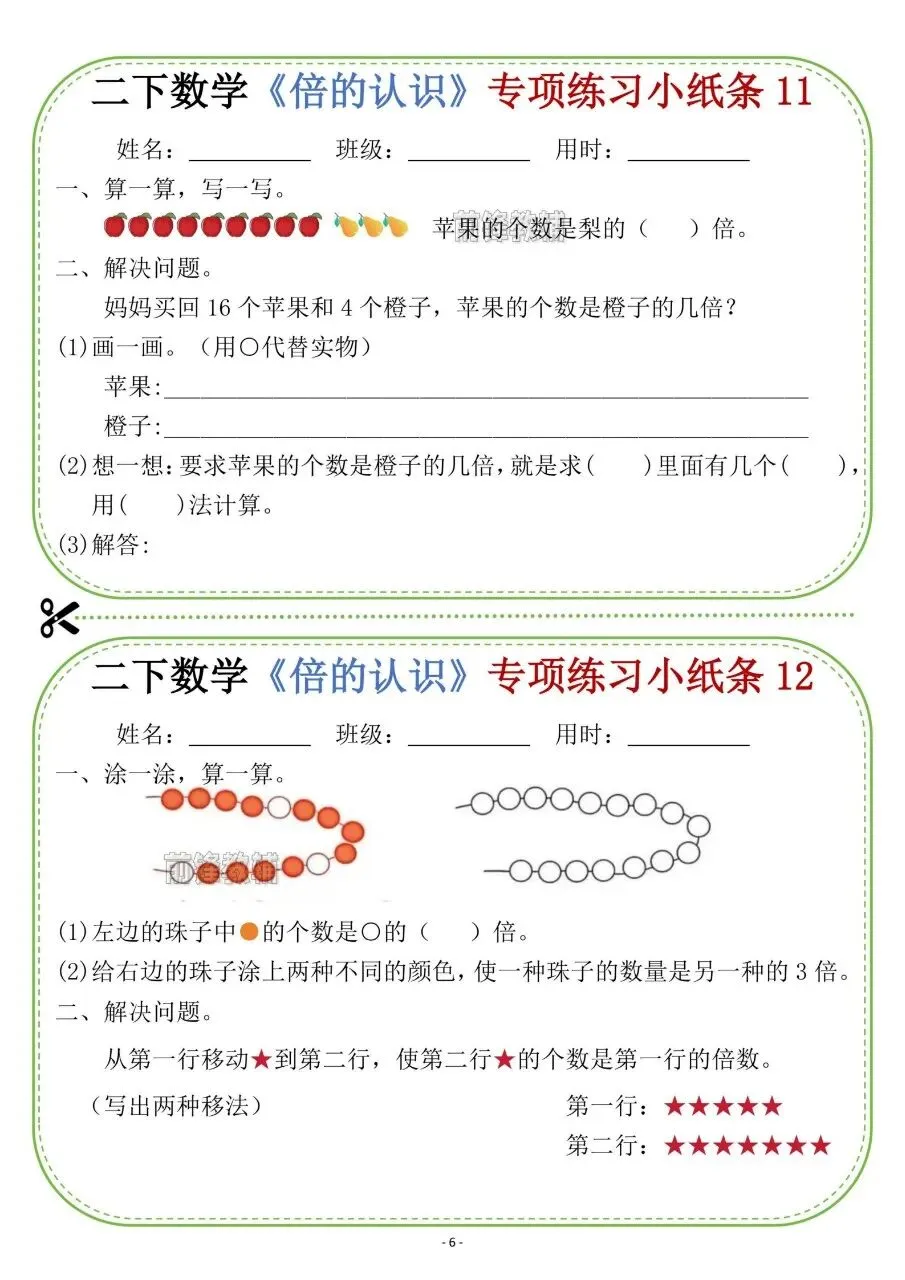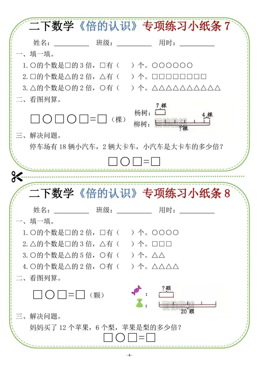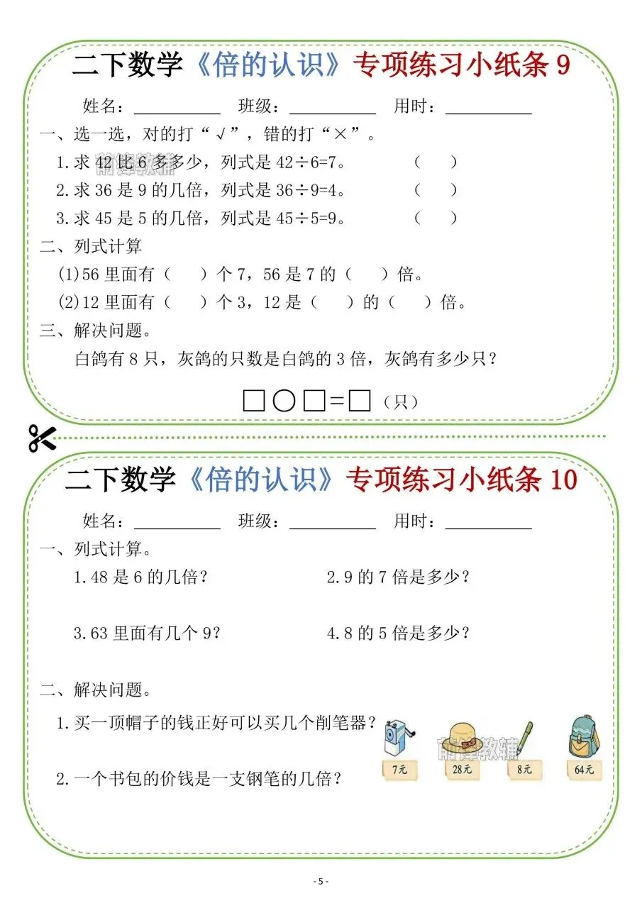 二下数学《倍的认识》专项练习小纸条电子版免费下载!