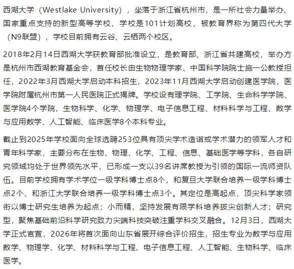 西湖大学综合评价简介
