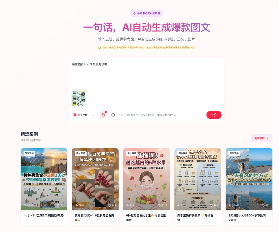 第一步:输入主题,也可以根据需要上传参考图。不管是“周末露营攻略”还是“专业保险科普”,给它一个方向就行。