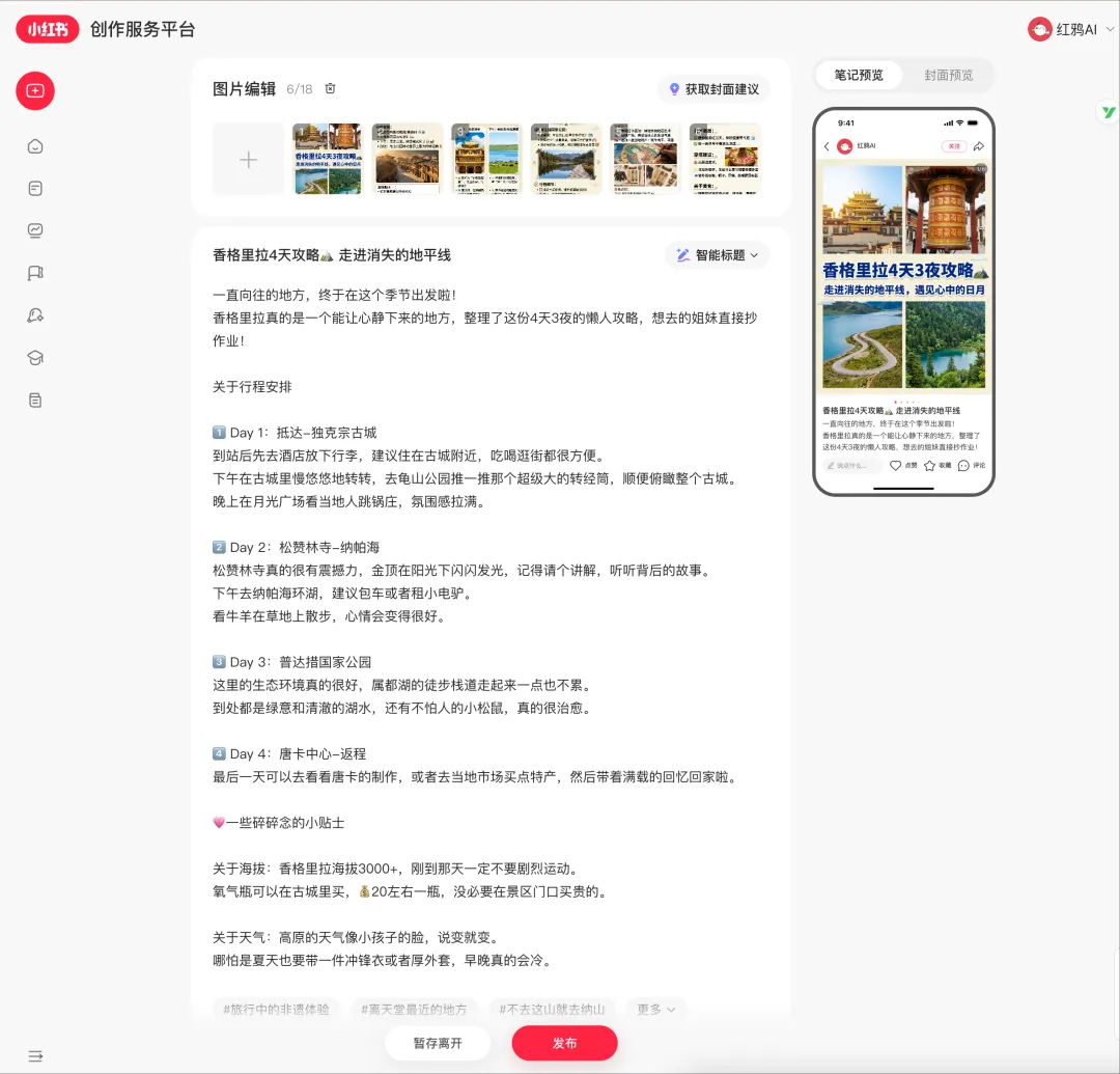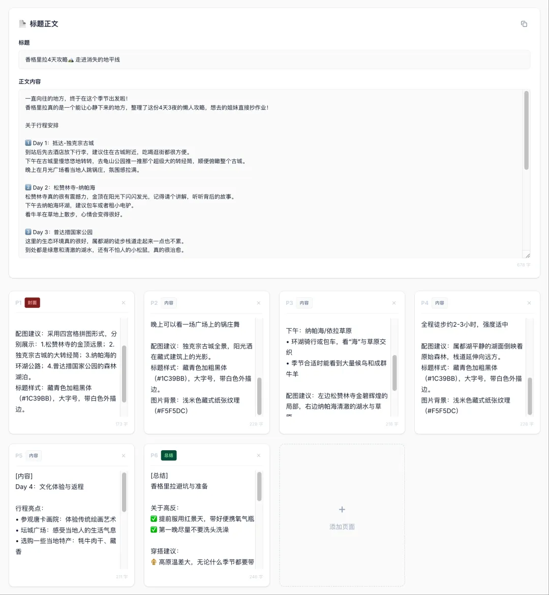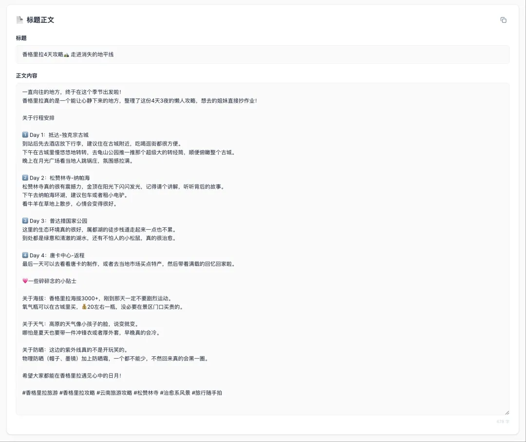 第二步:生成对应的标题、正文以及每一张图的图片描述。它会自动规划好每一张图的文案、构图建议,你可以直接在上面进行微调。