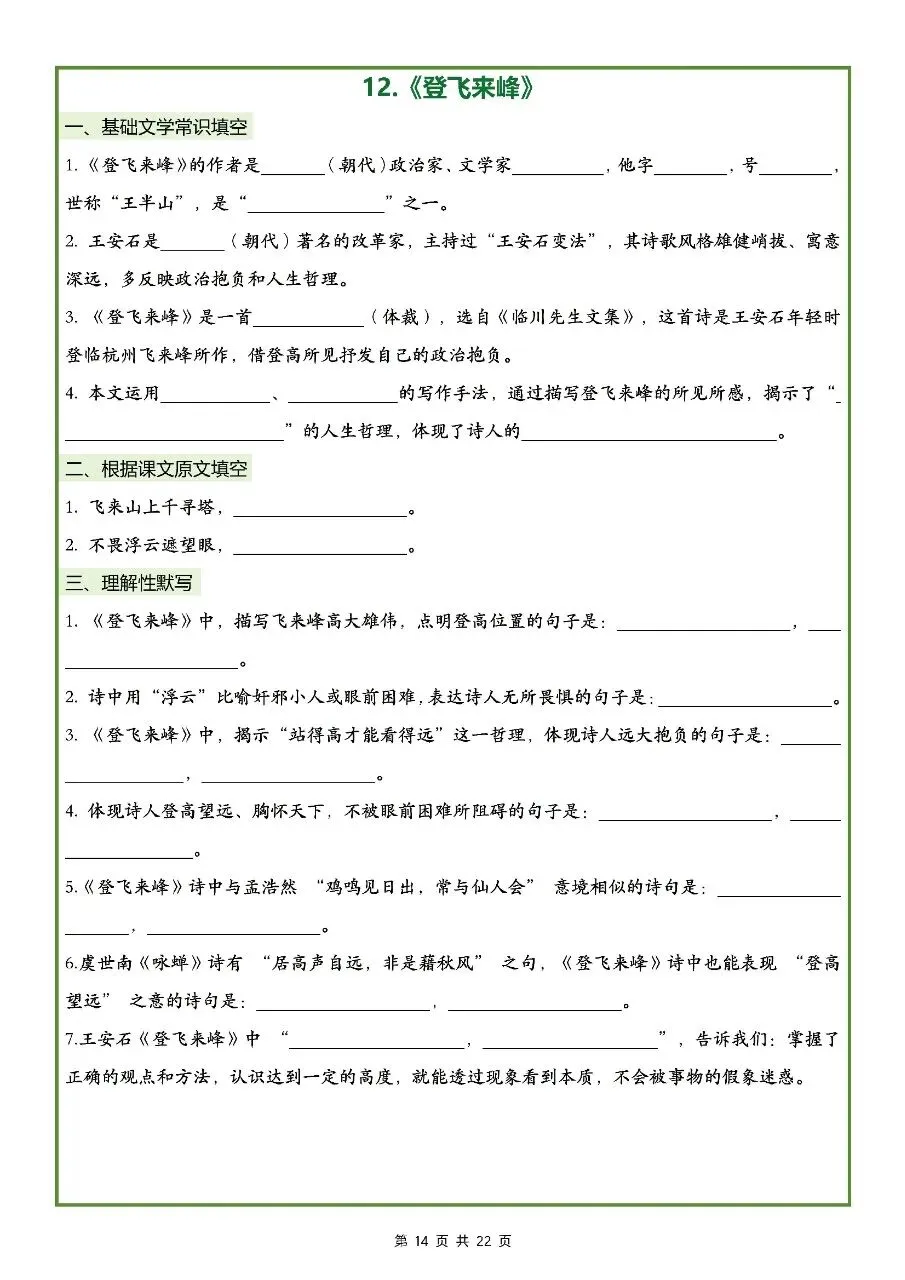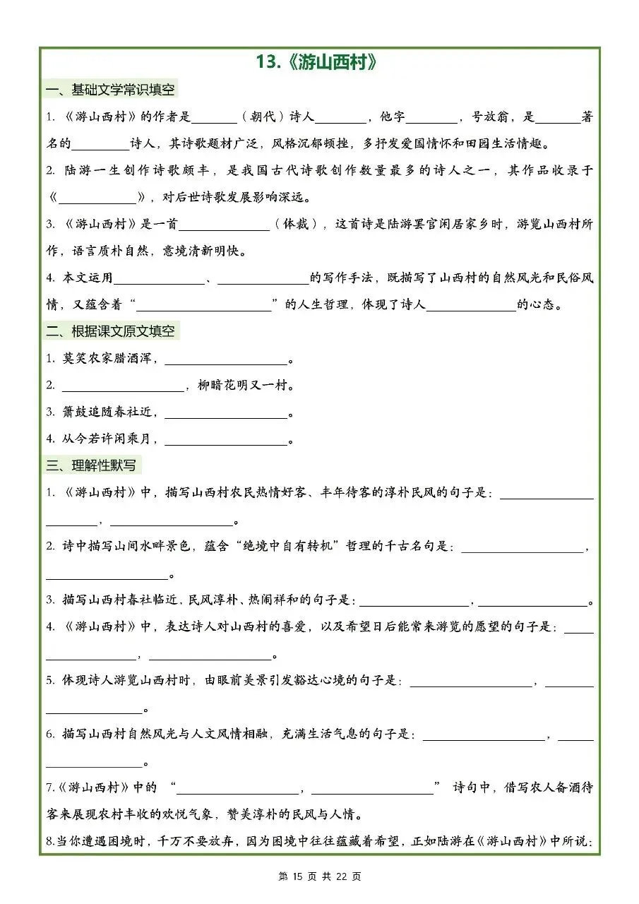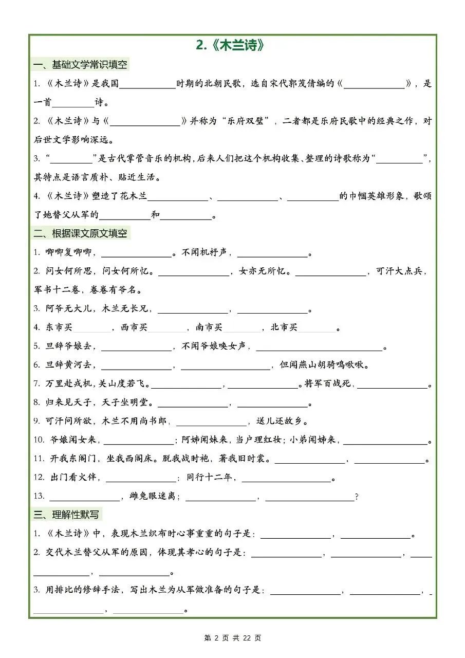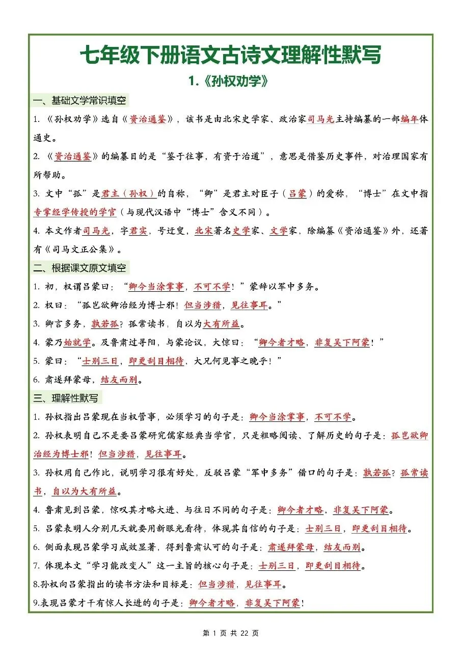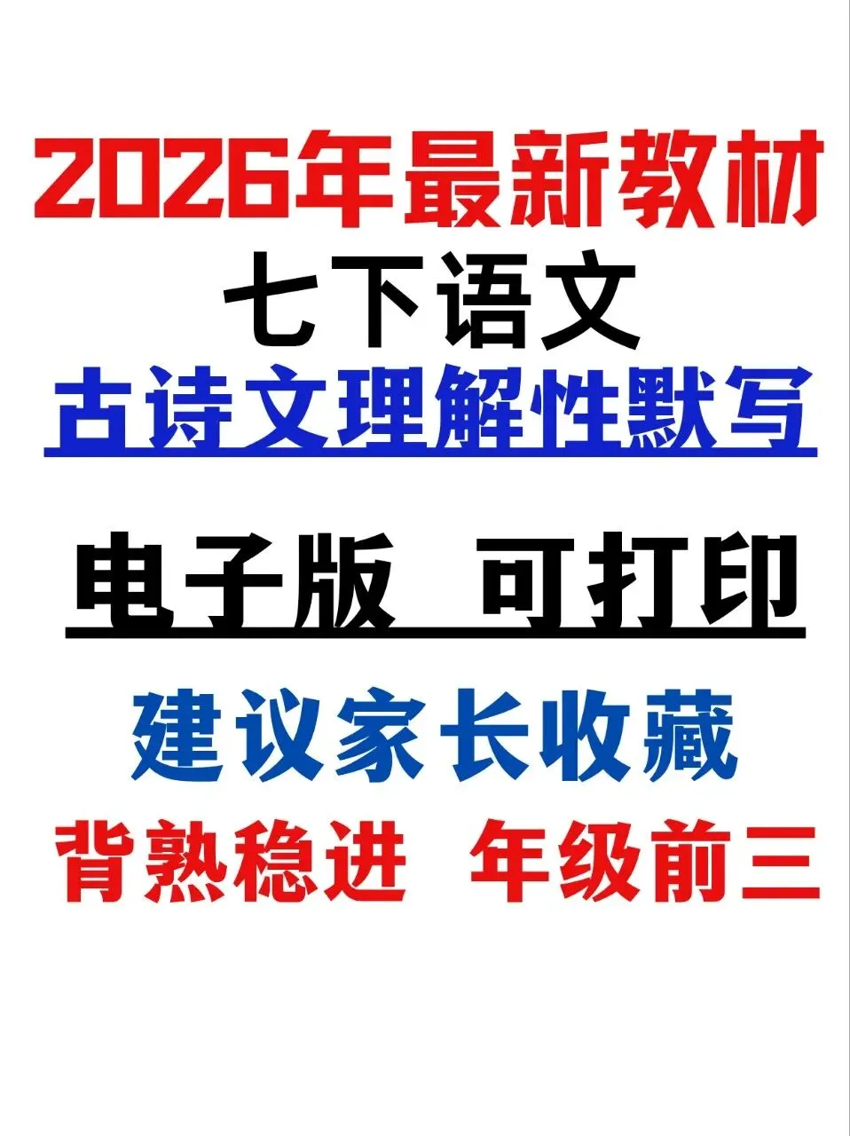 2026年最新版七年级下册语文古诗文理解性默写(默写版+背诵版) 有完整电子版可打印,学霸学习好帮手,建议家长打印,学霸人手一份!