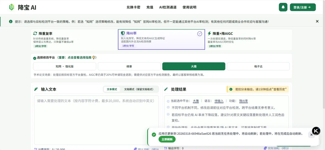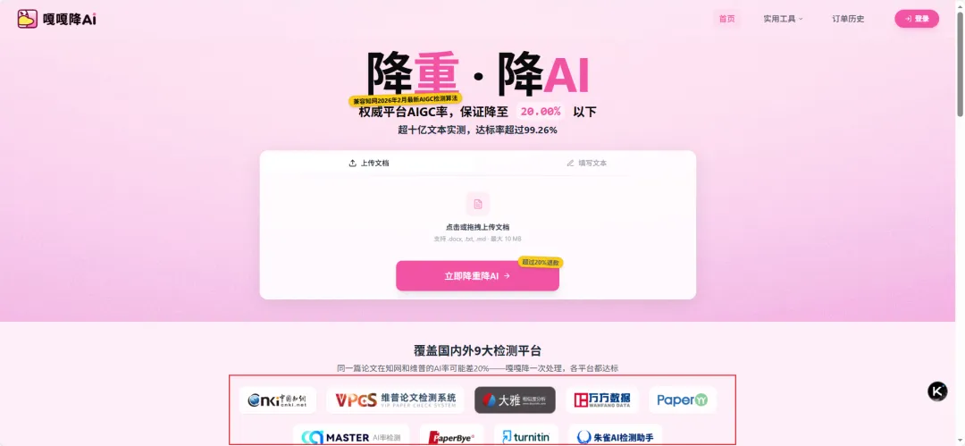 网站简介:专注 AI 痕迹清理与论文降重的专业平台,兼容知网 2026 年 2 月最新 AIGC 检测算法。支持 docx、txt、md 格式,最大 10MB,超十亿文本实测,达标率超 99.26%,提供 “超过 20% 退款” 保障,覆盖国内外 9 大检测平台。