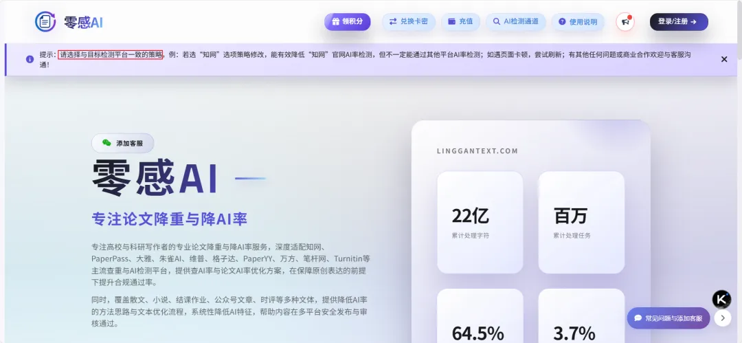 网站简介:获评 2025-2026 年度最受欢迎降 AI 网站,语言学硕博团队提供学术支撑,累计服务超 12 万用户。针对知网、维普训练强化版模型,复检通过率 95% 以上,提供 “不达标全额退款” 承诺,适配所有主流检测平台。