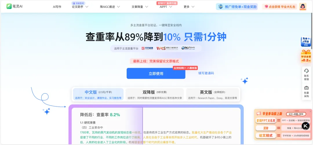 网站简介:集查重与降重于一体的论文辅助平台,针对知网、维普等主流 AIGC 检测系统优化,每天可免费查重一篇,提供智能降重与人工降重两种方案,支持中英文论文处理,适合学生日常论文写作与修改。