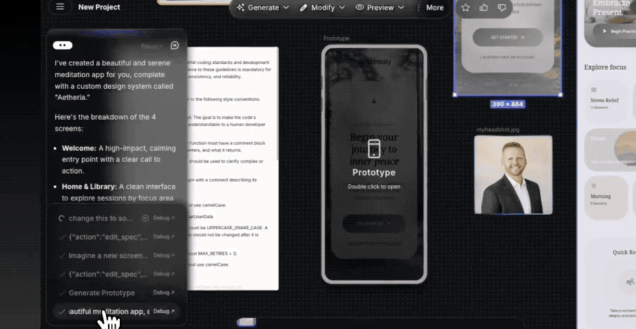 第三件事,是可见即所得的编辑与交互验证能力。你可以在画布上直接选元素,做精细修改,不需要离开上下文。