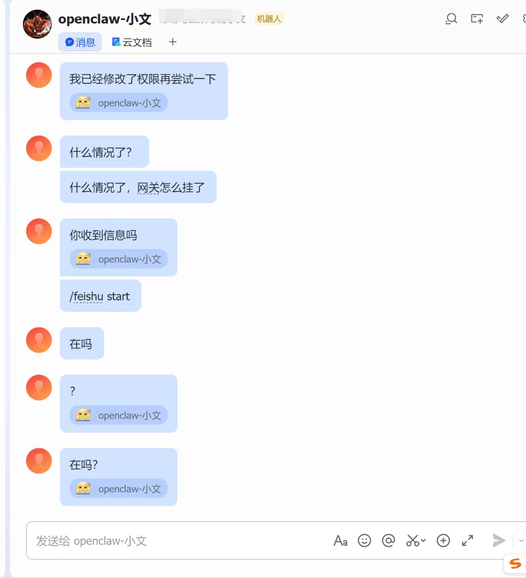 我最开始图省事,直接让小龙虾自己去读飞书官方的安装文档,然后自动执行安装步骤。结果刚运行没多久,小龙虾就掉线没反应了。