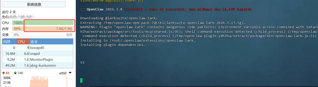 结果安装过程中,服务器直接卡死了 —— 我查监控发现 CPU 和内存都被占满了。我没敢贸然重启(怕丢配置),硬等了半个小时,服务器才恢复正常,但插件安装界面报了一堆错,显然没装成功。