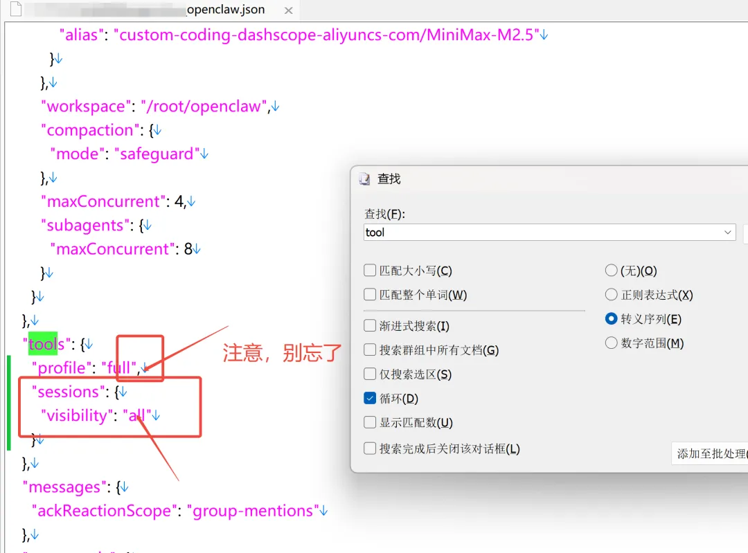 本以为终于搞定了,结果发现小龙虾还是没法读取飞书文档,也没法流式输出。我去翻 OpenClaw 的配置文件,才发现 OpenClaw 3.2 版本默认把新 Agent 的工具权限关掉了。
