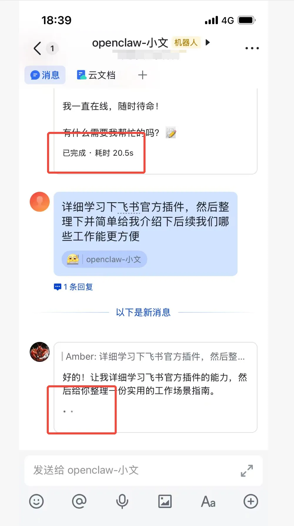 用大白话解释就是:以前小龙虾在飞书里干活,得靠你手动给它传文档、发消息内容,还得等它一次性出结果,干等的时候啥都不知道;现在装了这个官方插件,相当于给小龙虾开了 “飞书专属权限”,它能自己去翻你的飞书文档、查日历、看群聊记录,而且回复的时候是 “边想边说”(流式输出),你能实时看到进度,不用再傻等半天。