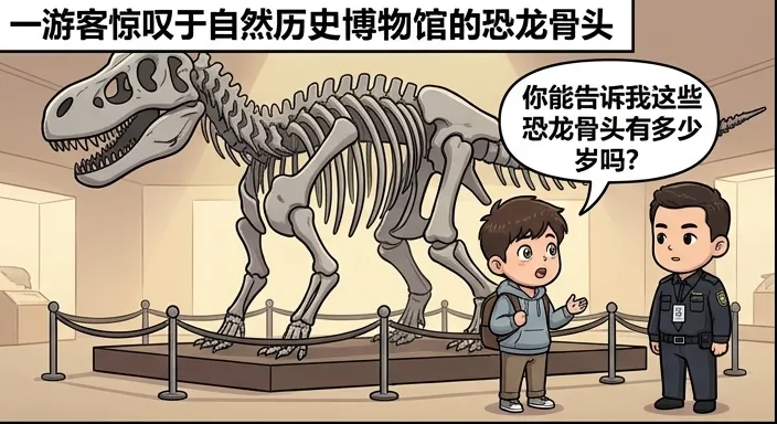 一游客惊叹于自然历史博物馆的恐龙骨头,他问保安:“你能告诉我这些恐龙骨头有多少岁吗?”