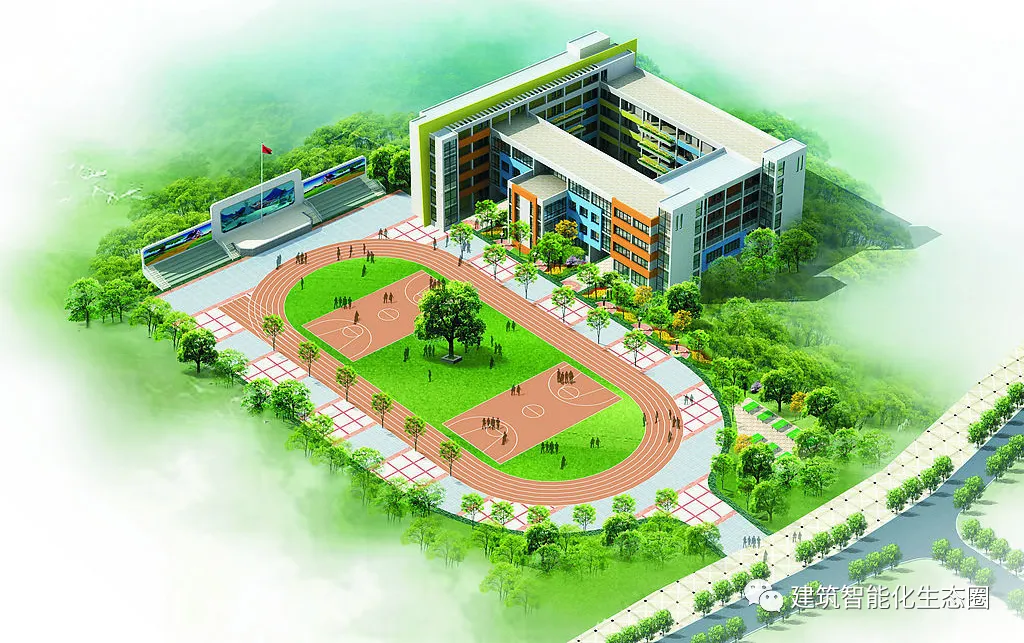 该学校设计范围包含:教学楼,综合楼,宿舍楼,室外体育场运动场等等。