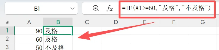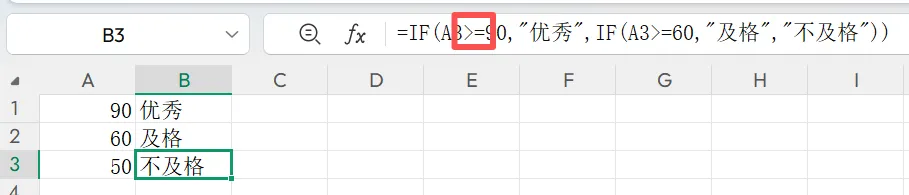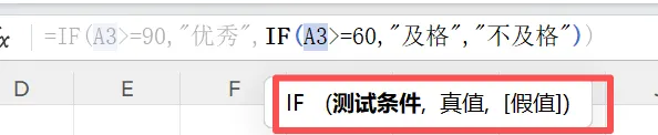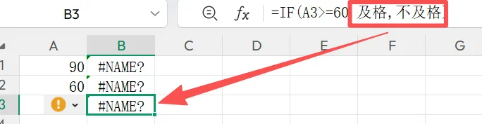 2、返回结果是文本时,如“及格”“不及格”,文本内容需要加英文状态双引号,否则结果会报错。