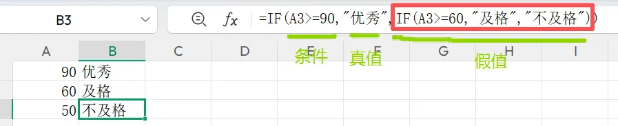 比如:=IF(A1>=90,”优秀”,IF(A1>=60,”及格”,”不及格”)),表达大于等于90分时是优秀,如果小于90分,会继续按照嵌套的第二个if函数(黄色部分),表达大于等于60分,返回及格,剩下的情况属于不及格。从左到右依次筛查判断。整个黄色部分相当于第一个if函数的第三个参数:条件不成立时返回的值。