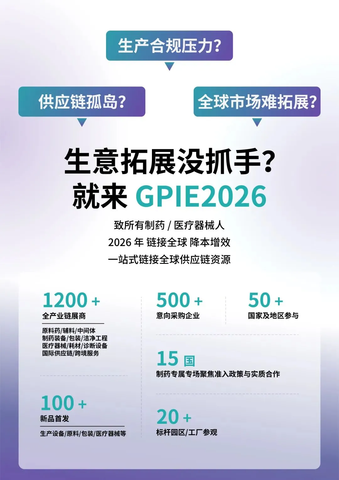 GPIE 2026不仅是产品与技术的展示平台,更是贯穿 研发、生产、供应链 的协同创新枢纽。我们致力于推动AI制药、绿色生产、跨境供应等前沿议题的落地,并通过精准对接、政策解读、园区考察等系列活动,助力企业高效布局全球市场。