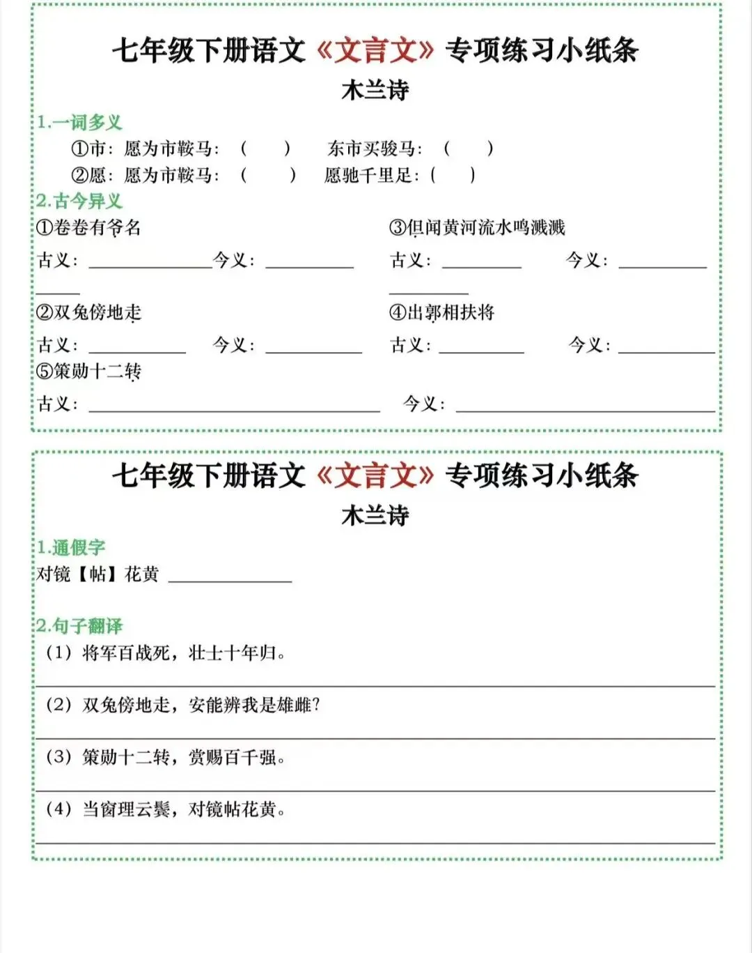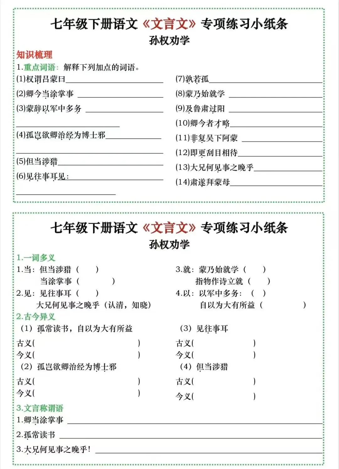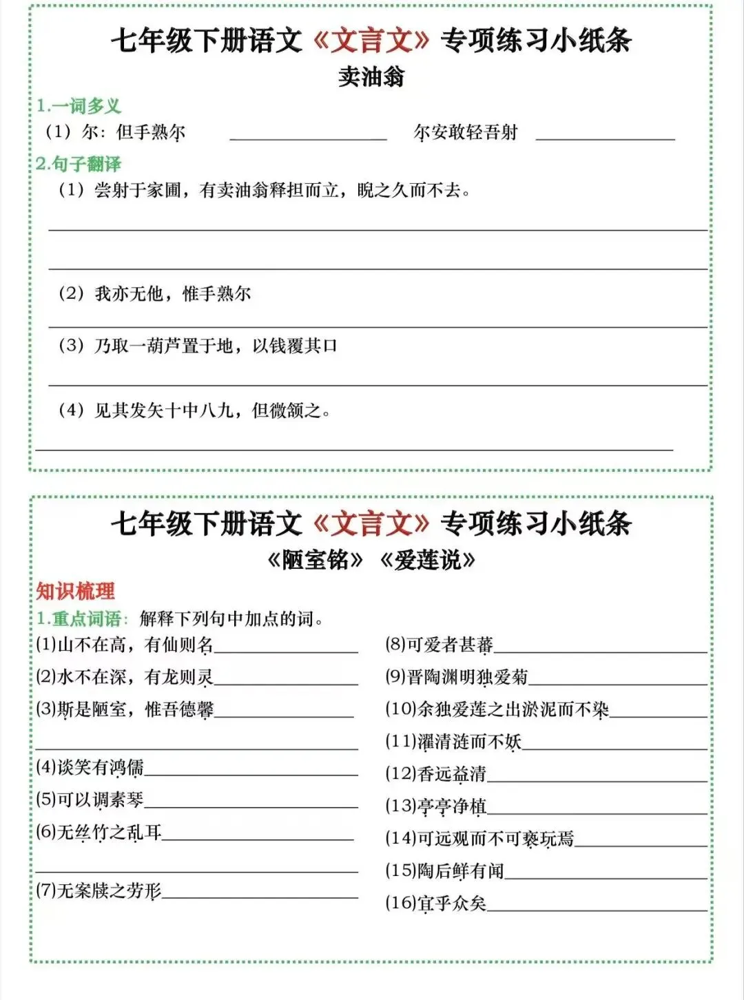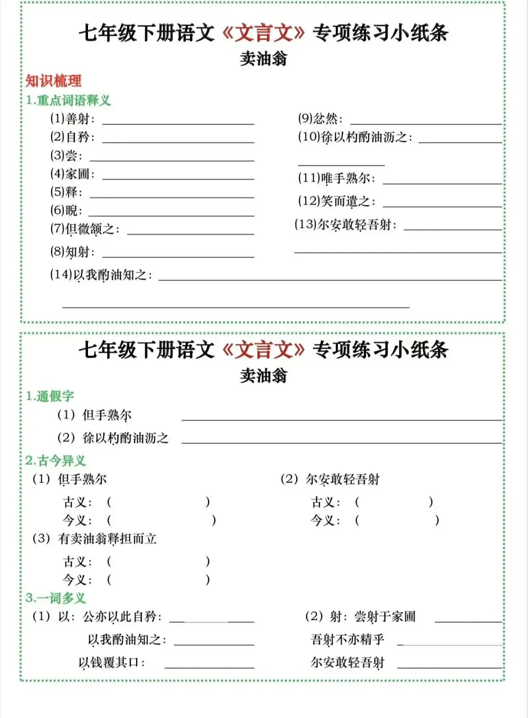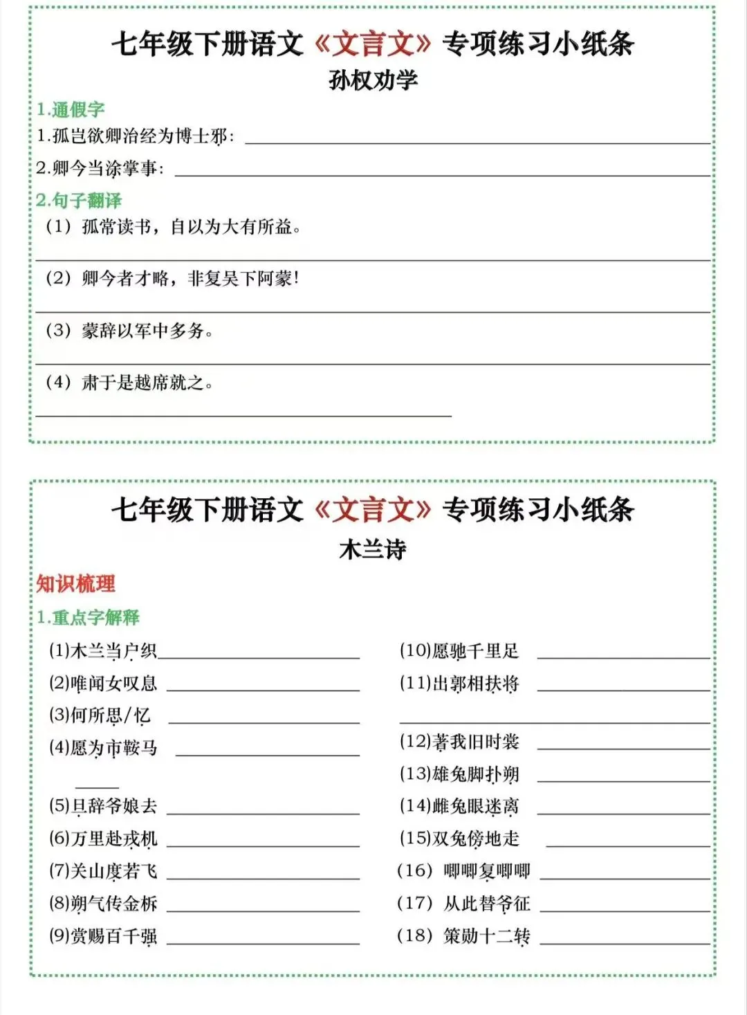 七年级下语文《文言文》复习/电子版可打印 以下为部分截图,具体看完整PDF文件 (温馨提示:文末有电子版领取方式) 领取完整电子版: ①:点一点右下角的“赞”和“在看”,感谢支持! ②:点击“关注”,回复资料领取