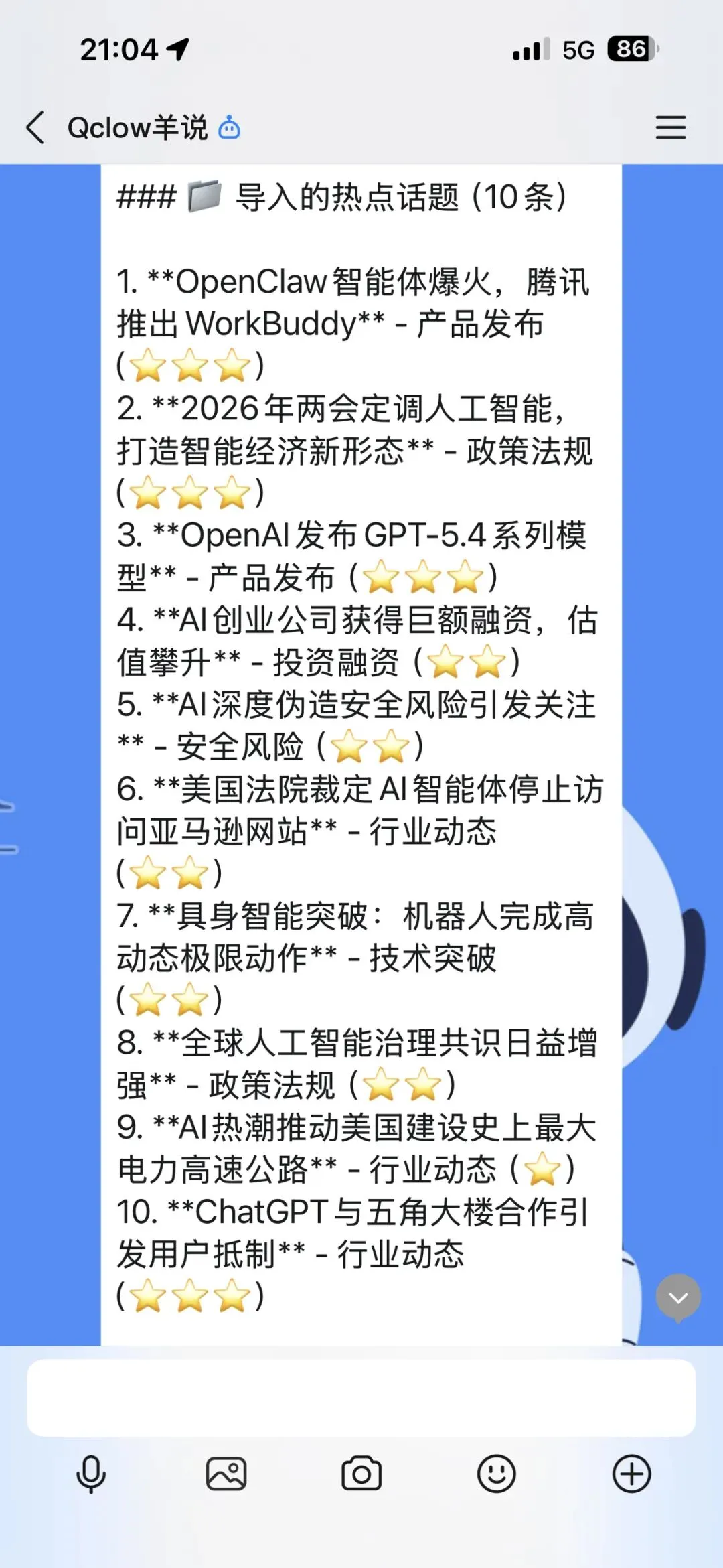 现在每天早上7点,它自动搜昨晚的AI新闻,提炼成三条朋友圈文案发到我企业微信。我扫一眼,觉得OK就复制发朋友圈,或者直接让它帮我发。三十秒搞定,再没断更过。