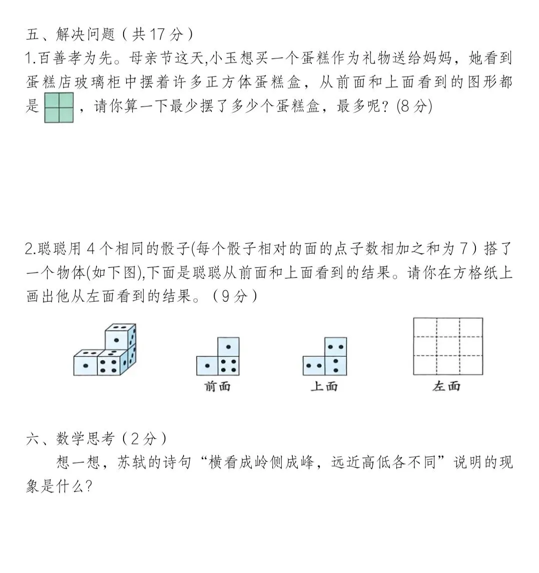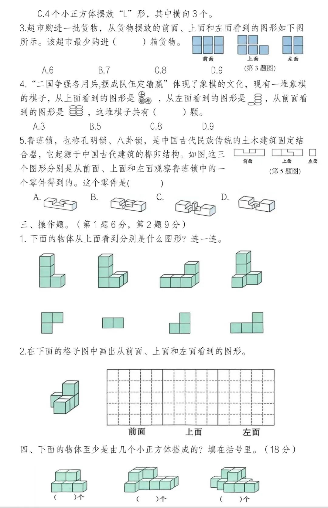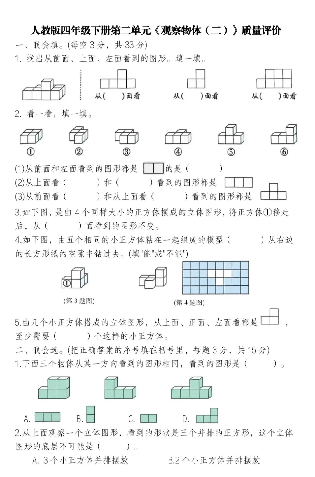 【试题资源】人教版四年级下册第二单元《观察物体(二)》测试卷
