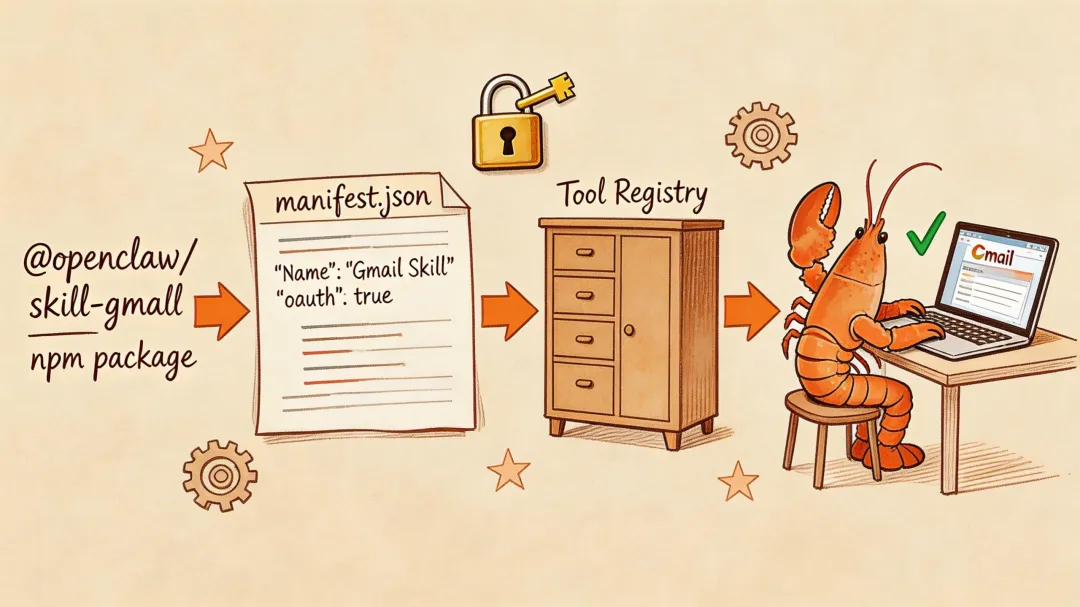 Layer 2 — Skills 插件:通过 npm 包安装的能力扩展。Gmail、Calendar、GitHub 这些第三方集成都走这层。社区可以贡献新 Skill。