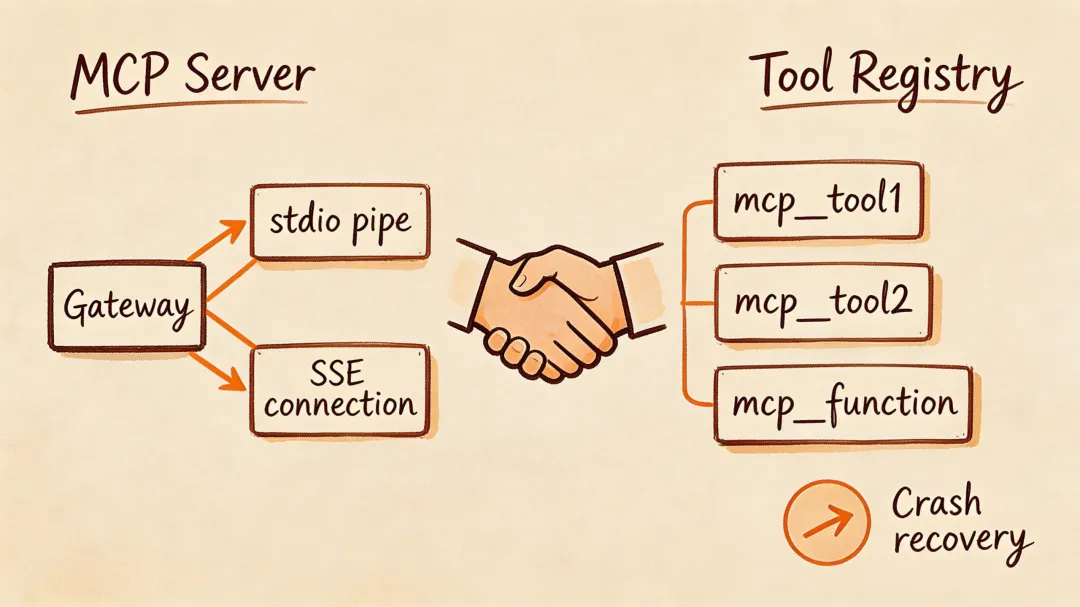 3. 崩溃自愈:MCP Server 挂了不会影响其他工具,后台指数退避重启,恢复后自动重新注册。