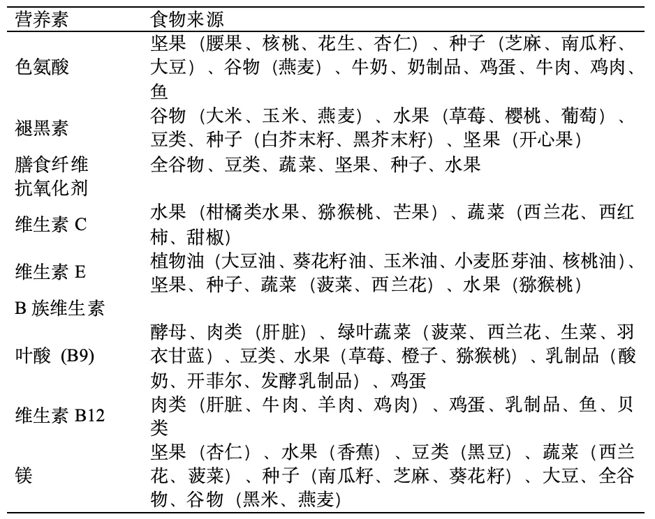 适当多进食有促进睡眠作用的富含色氨酸等的食物:色氨酸是一种必需氨基酸,在小肠吸收,是血清素(5-羟色胺)和褪黑素等生物活性化合物的前体,参与情绪、睡眠和生物节律的调节,并用于治疗失眠、睡眠暂停和抑郁症; -