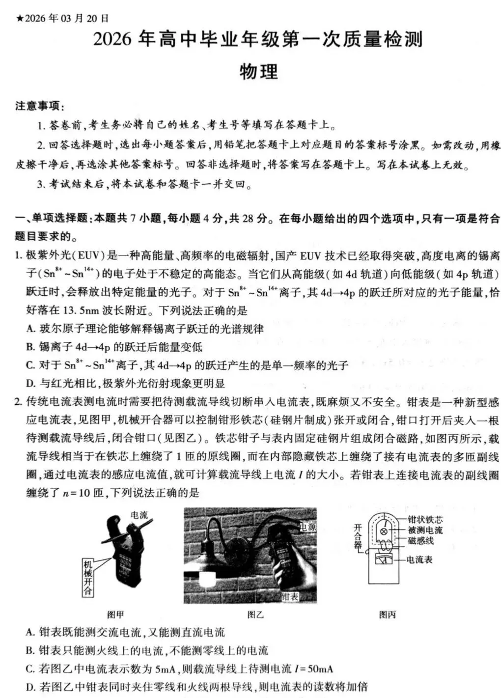 河南五市2026届高三下学期第一次联考物理试题及答案