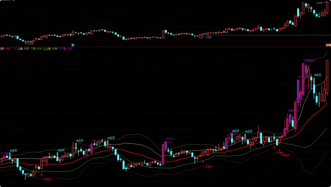 DRAWTEXT(CLOSE > 上上轨, HIGH*1.01, ‘★成龙头’), COLOR880088;
