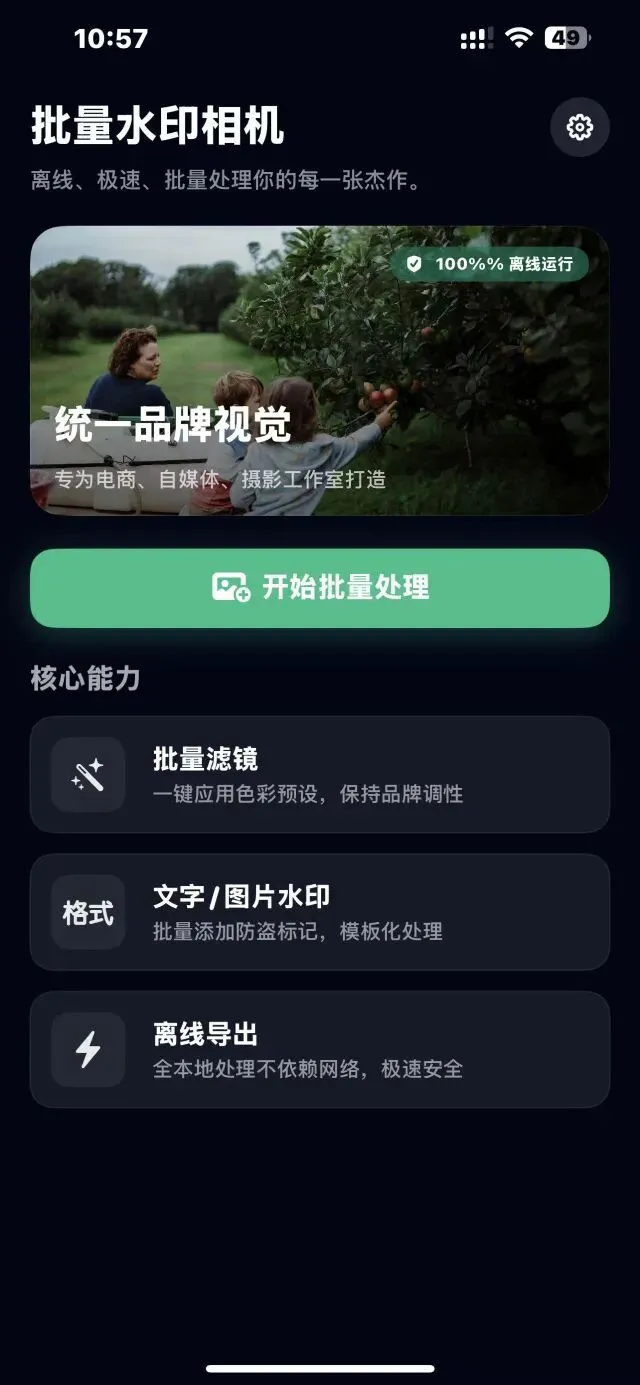 它支持批量添加文字或图片水印,可自定义水印的位置、大小和透明度,同时提供多款质感滤镜一键美化图片。处理后的图片支持无损导出,全程无广告干扰,所有操作均在本地完成,不上传服务器,充分保障用户隐私与数据安全。无论是商品图防盗、原创内容署名,还是职场文件盖章,都能一键搞定,省时省力。