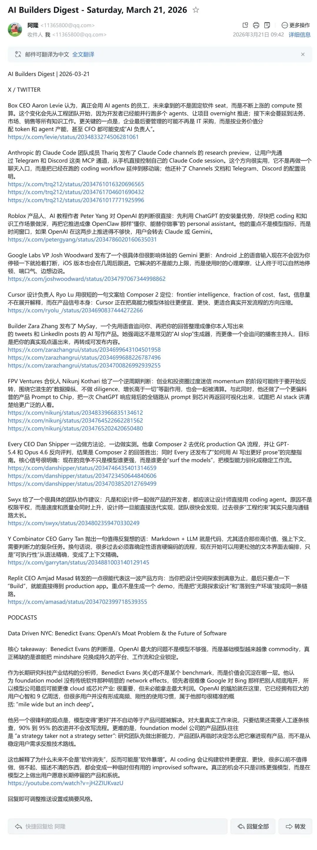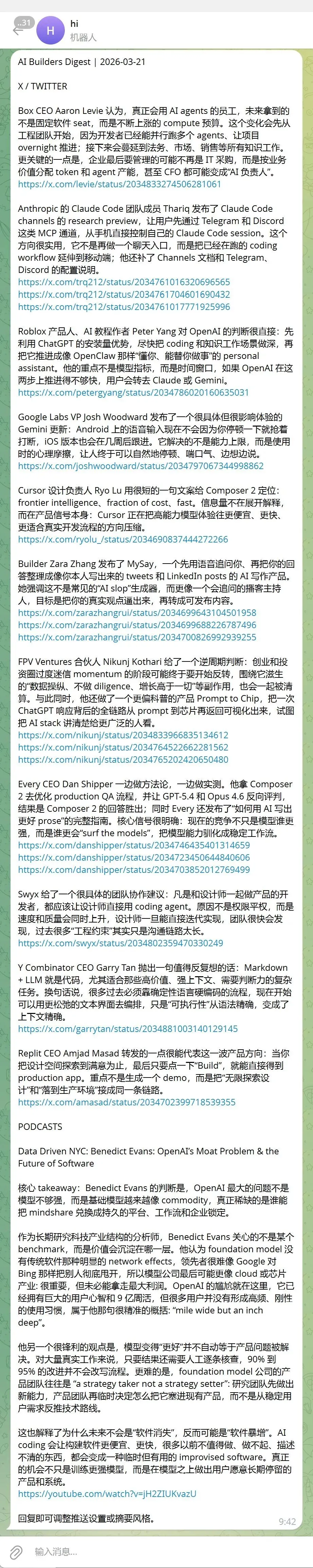 Follow Builders 就帮你把这些全部抓下来,翻译好,整理好,打包成一份摘要,按你设定的时间推送给你。