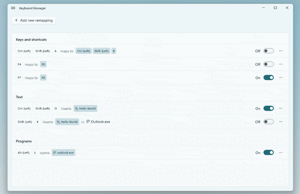 键盘管理器迎来全新预览版编辑器界面,采用更现代化的视觉设计,将按键与快捷键重映射整合至统一界面,并支持单独启用或禁用某条规则而无需删除。