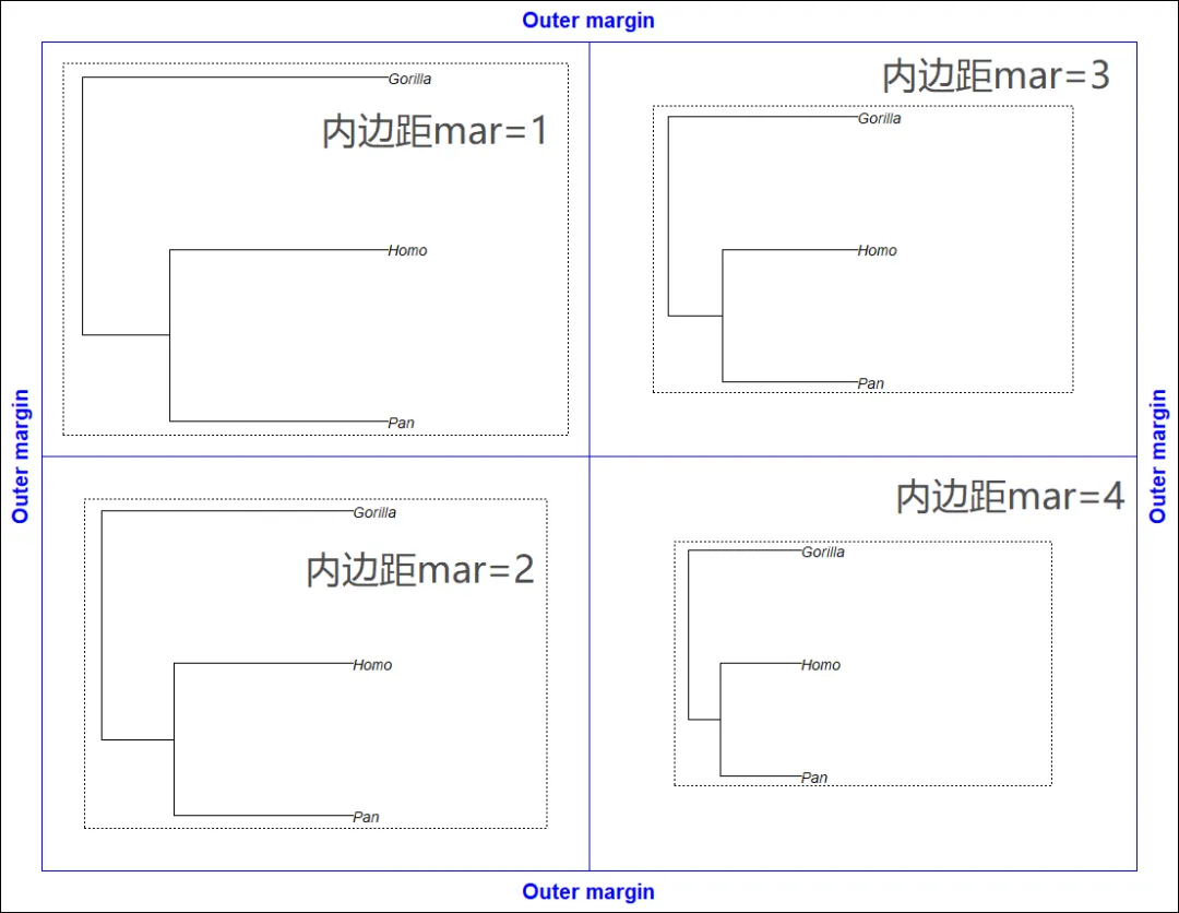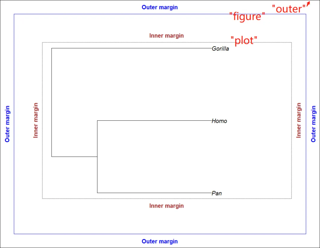现在,我们可以在绘制树图时看到图形的一些几何细节。我们首先设置外边距 (Outer margins, 图形参数oma),默认为0,然后通过调用box() 3次并使用适当的选项来显示内、外边距: