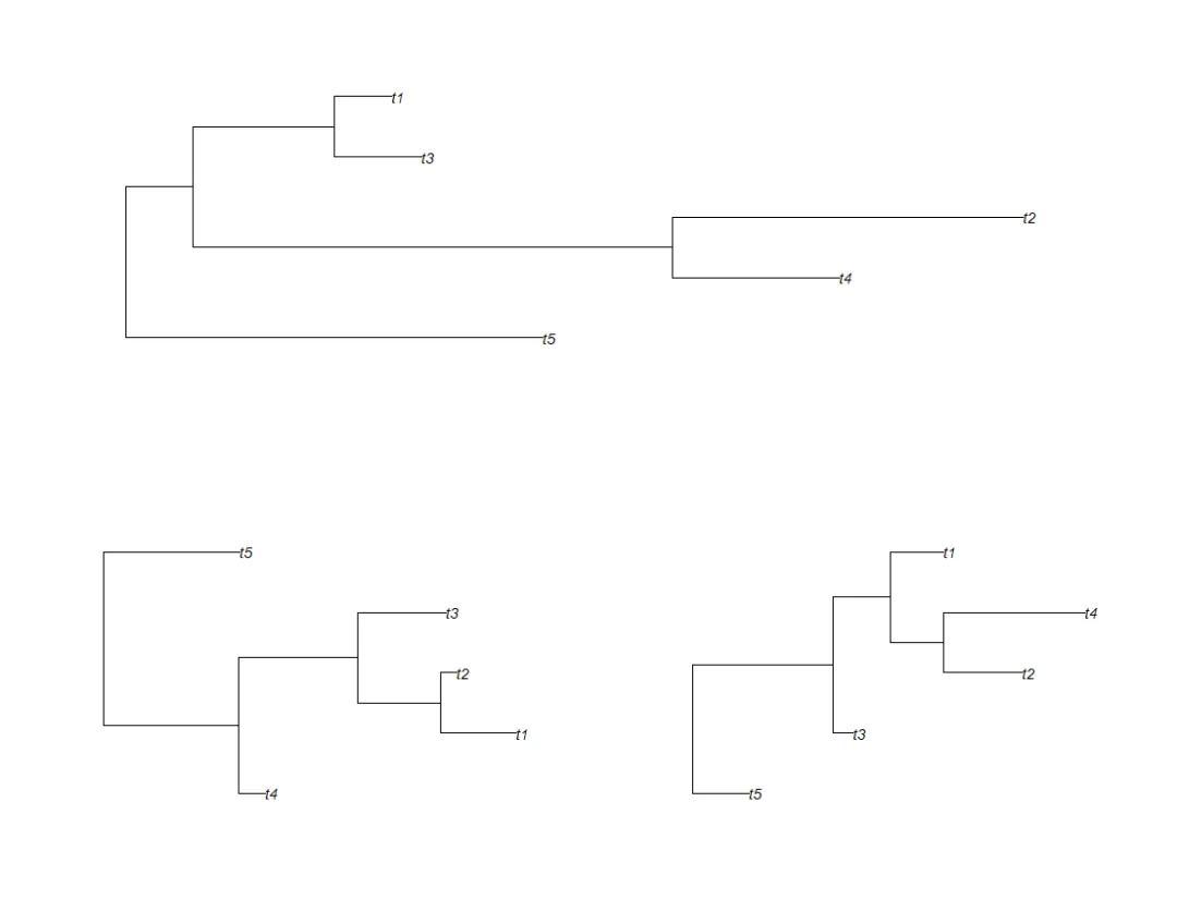 请注意,第1棵树没有分枝长度,因此两棵树的比例尺(Scales)明显不同。