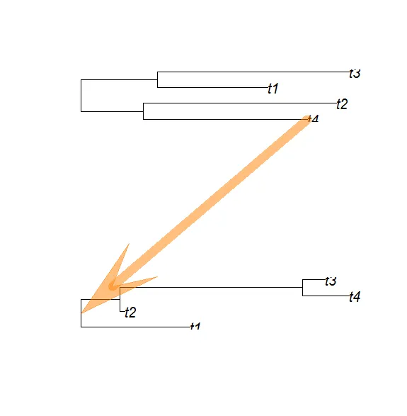 foo <- function(phy1, phy2, from){layout(matrix(1:2, 2))plot(phy1, font = 1)pp <- get("last_plot.phylo", envir = .PlotPhyloEnv)from <- which(phy1$tip.label == from)x <- pp$xx[from]y <- pp$yy[from]## fraction of the plot region:pu <- par("usr")## convert into inches:pi <- par("pin")mi <- par("mai")xi1 <- (x - pu[1]) / (pu[2] - pu[1]) * pi[1] + mi[2]yi1 <- (y - pu[3]) / (pu[4] - pu[3]) * pi[2] + mi[1]plot(phy2)pp <- get("last_plot.phylo", envir = .PlotPhyloEnv)to <- Ntip(phy2) + 1x <- pp$xx[to]y <- pp$yy[to]## same as above:pu <- par("usr")pi <- par("pin")mi <- par("mai")xi2 <- (x - pu[1]) / (pu[2] - pu[1]) * pi[1] + mi[2]yi2 <- (y - pu[3]) / (pu[4] - pu[3]) * pi[2] + mi[1]yi1 <- yi1 + par("fin")[2]di <- par("din")layout(1)par(new = TRUE, mai = rep(0, 4))plot(NA, type = "n", ann = FALSE, axes = FALSE, xlim = 0:1,ylim = 0:1, xaxs = "i", yaxs = "i")fancyarrows(xi1/di[1], yi1/di[2], xi2/di[1], yi2/di[2], 1,lwd = 10, col = rgb(1, .5, 0, .5), type = "h")}