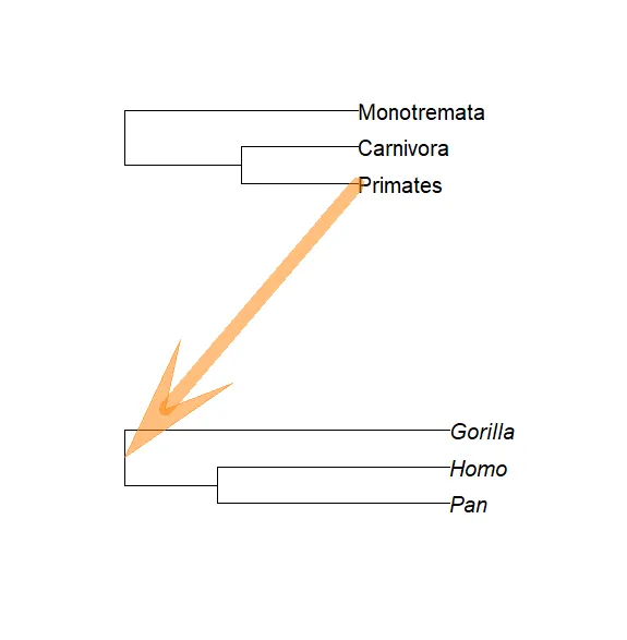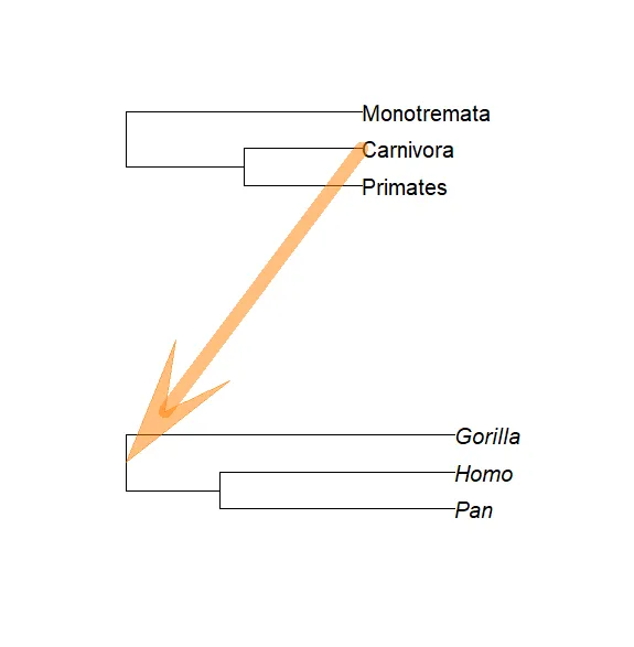 trb <- read.tree(text = "((Primates,Carnivora),Monotremata);")par(xpd = TRUE)foo(trb, mytr, "Carnivora")# foo(trb, mytr, "Primates")