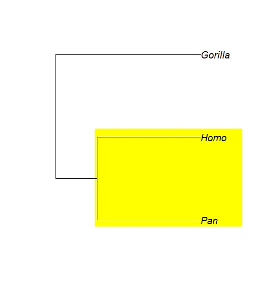 这些功能的另1个用途是绘制着色矩形(Coloured rectangles)背景来划分分枝。同样,我们可以使用par(new = TRUE)和plot.phylo的plot=FALSE选项,该选项打开并设置图形设备,坐标取自第2.2节详述的树,但未绘制任何图形。然后,用户可以调用任何低级绘图命令,然后在par(new = TRUE)之后使用plot()。例如,如果我们想画1个矩形来显示由人类和黑猩猩组成的分枝: