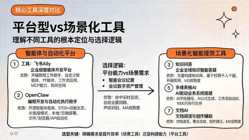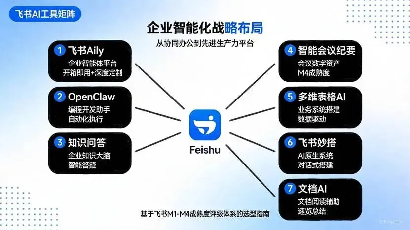 核心洞察:飞书AI工具矩阵已从协同办公平台演进为AI时代先进生产力平台,致力于将AI深度融入企业知识和业务流程,提供“真能用、真落地“的企业级AI应用。本指南基于飞书官方M1-M4成熟度评级体系,为企业决策者提供从工具选型到实施落地的完整框架。