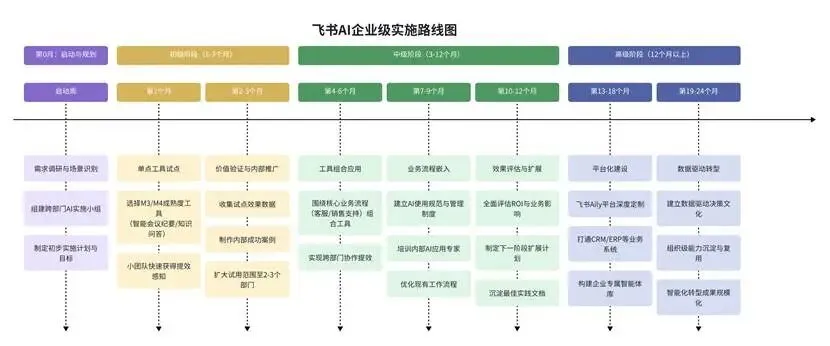 实施重点:围绕核心业务流程组合使用飞书AI工具。例如客服场景结合Aily智能客服和多维表格AI数据分析,销售场景整合智能会议纪要和知识问答。