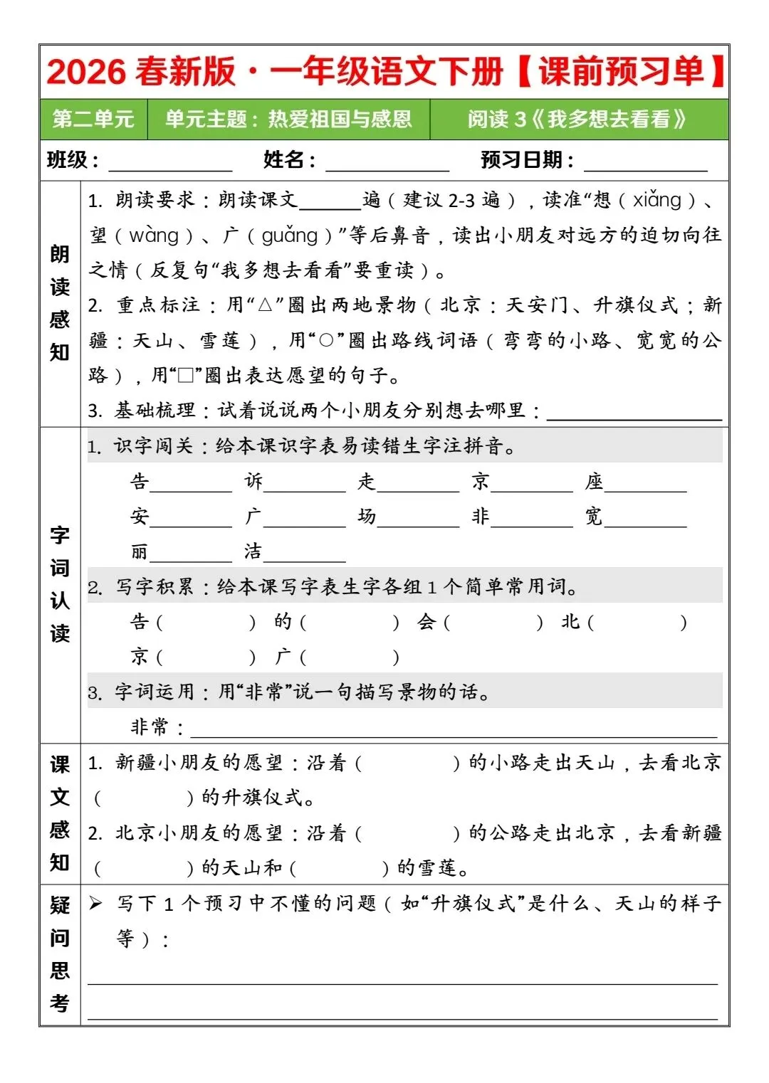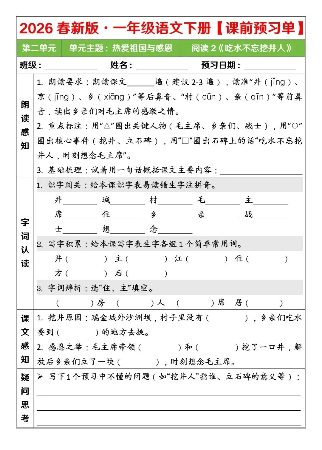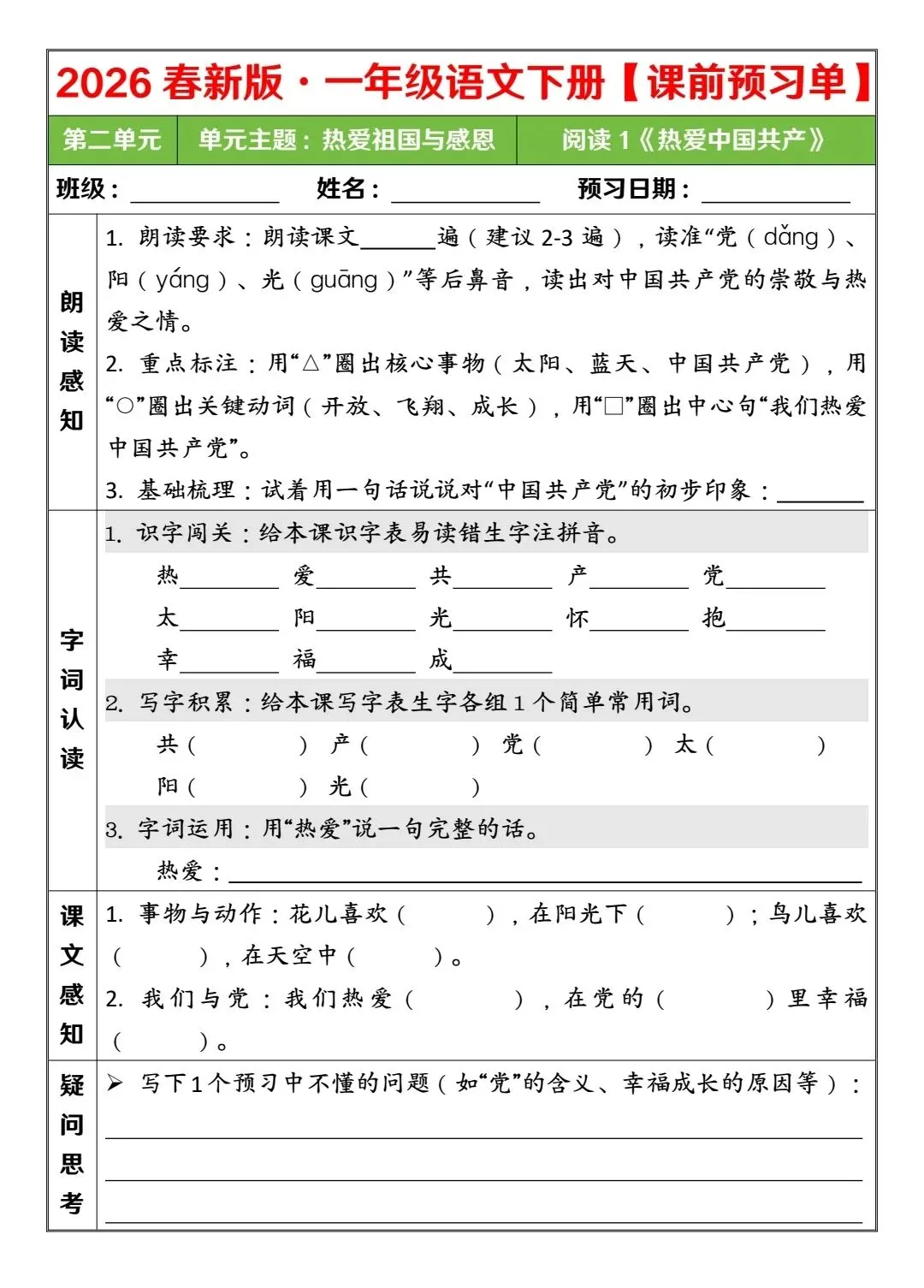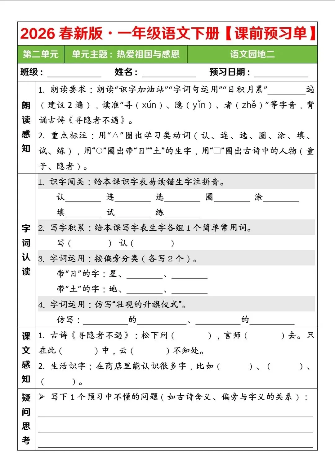 2026学年一年级下册语文【课前预习单】电子版可打印