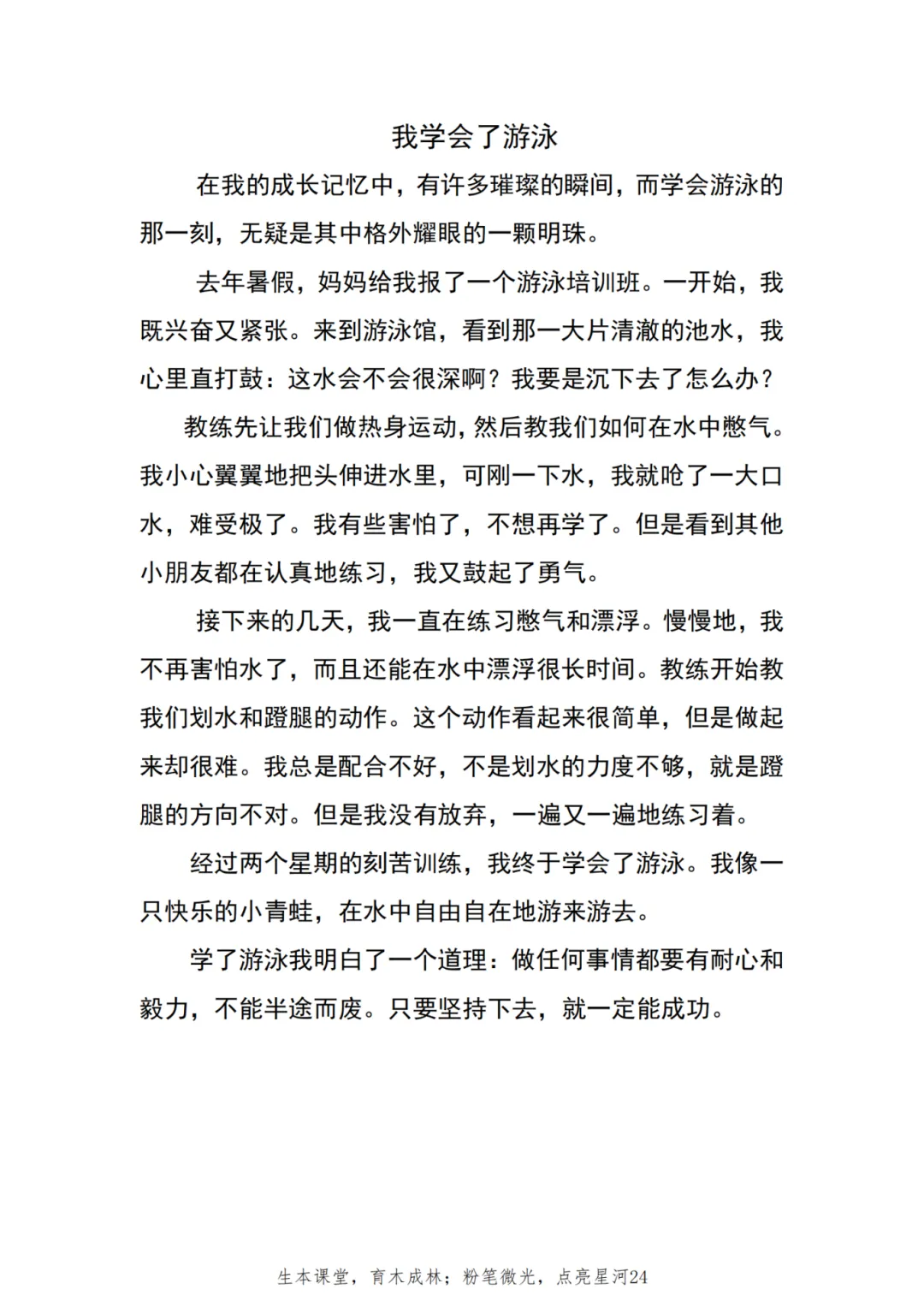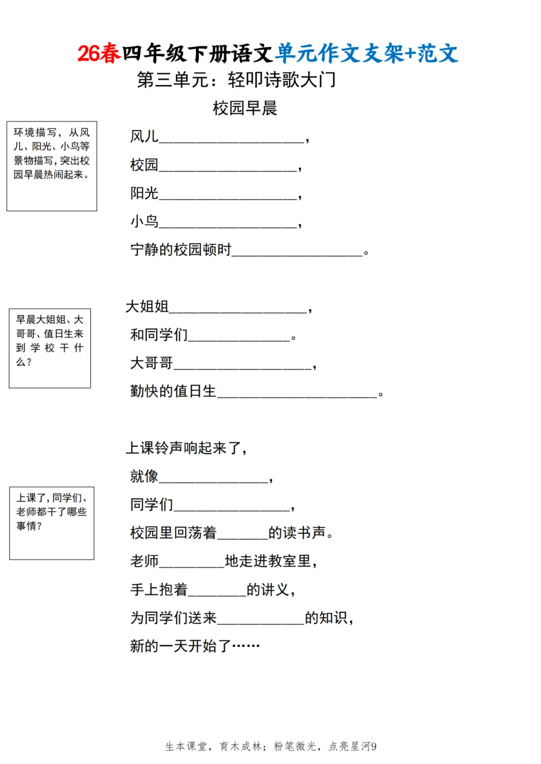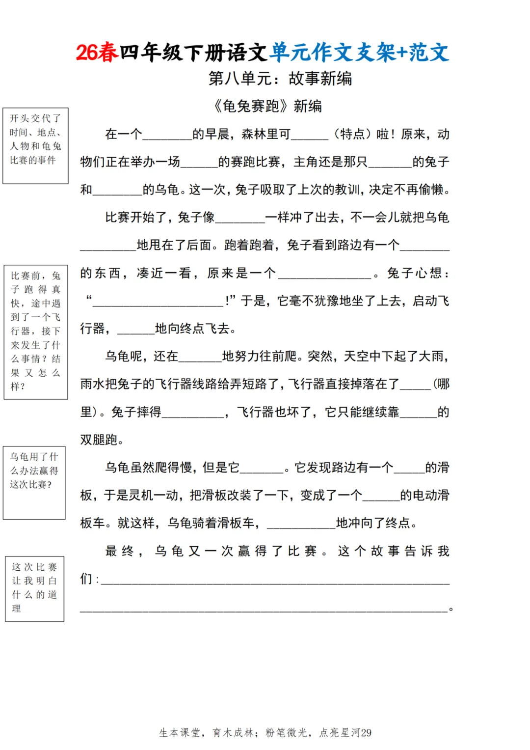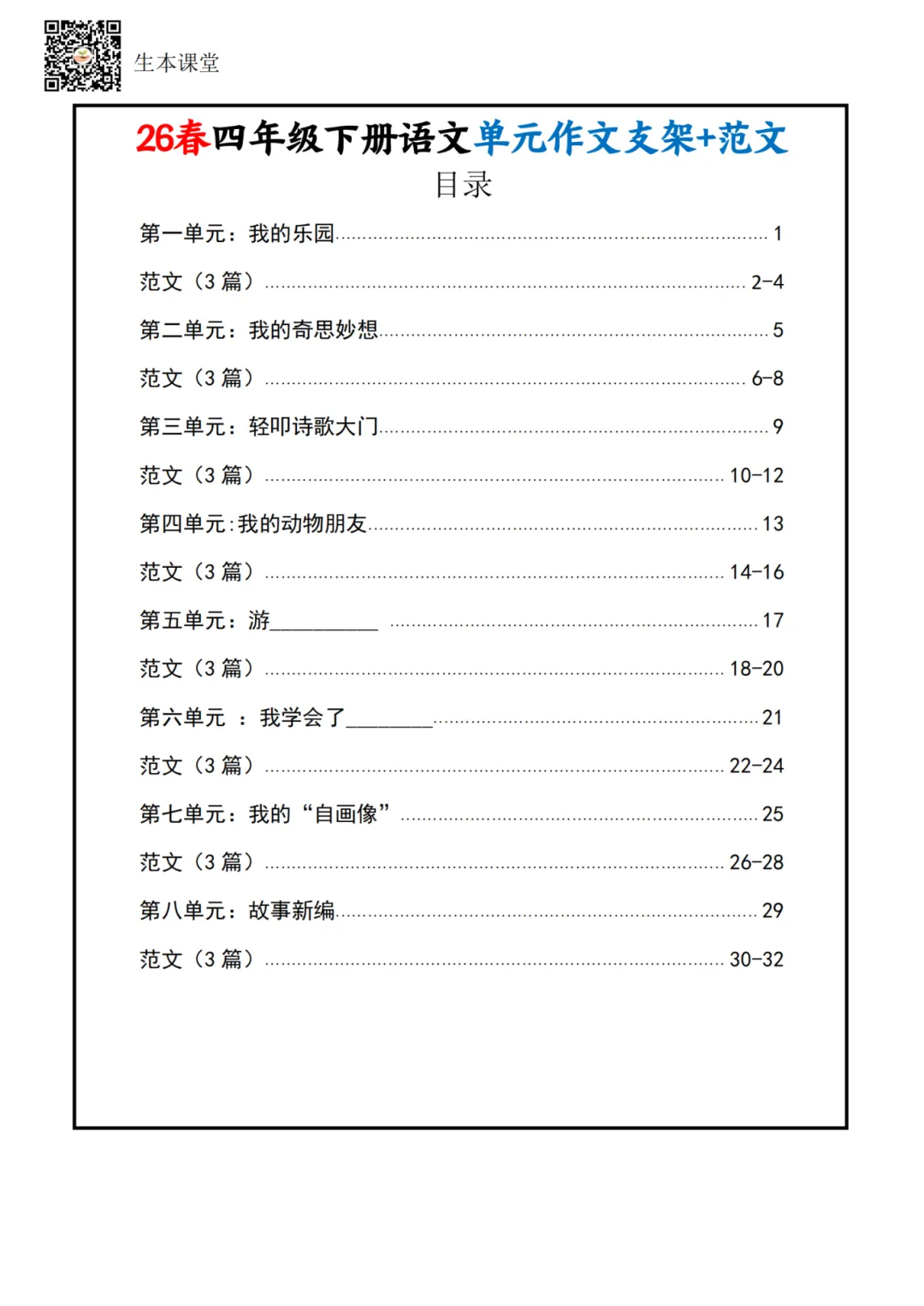小学语文四年级下册作文范文模板,例文,1-8单元习作共32页