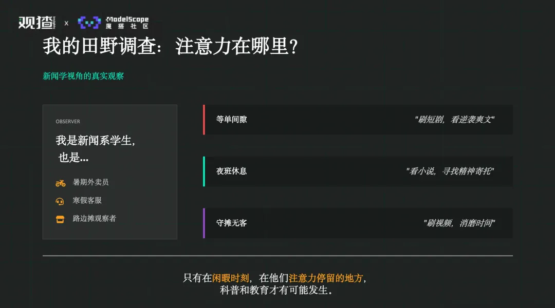 这些零散的场景在他脑子里慢慢拼到了一起。他发现,只有在闲暇时刻,在他们注意力停留的地方,科普和教育才可能发生。于是他有了一个看起来有点天马行空的想法——