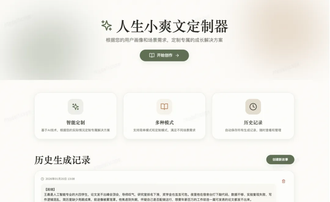 黑客松期间,他先用 Google AI Studio 把「人生小爽文定制器」的前端页面做了出来。页面结构、交互逻辑、生成方式都已经成型。但很快他发现,只做前端还不够——API Key 怎么管理?数据怎么存?生成记录怎么展示?这东西要怎么才算“一个产品”?