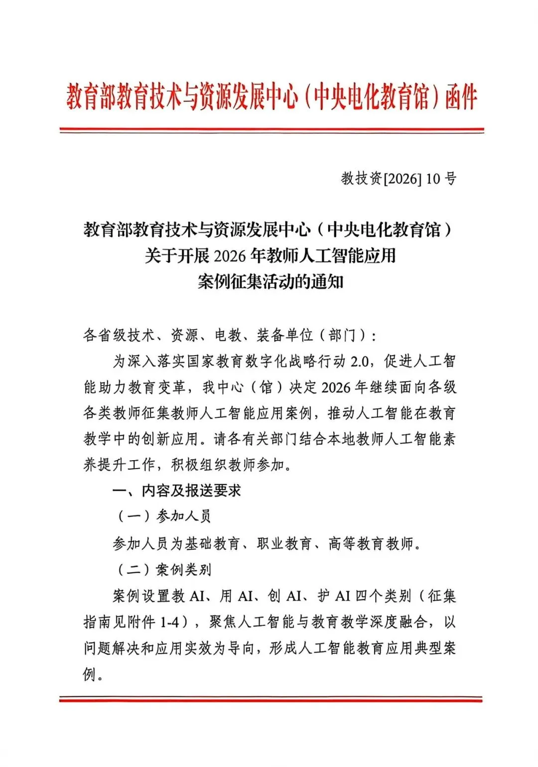 全国教师 | 教育部教育技术与资源发展中心(中央电化教育馆)关于开展2026年教师人工智能应用案例征集活动的通知