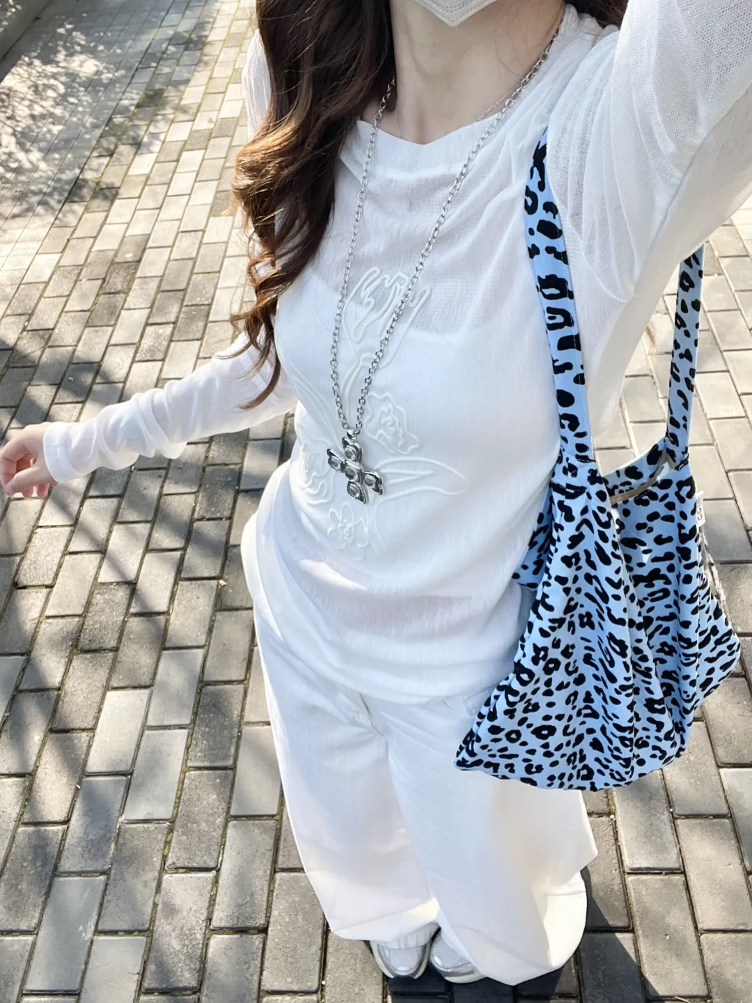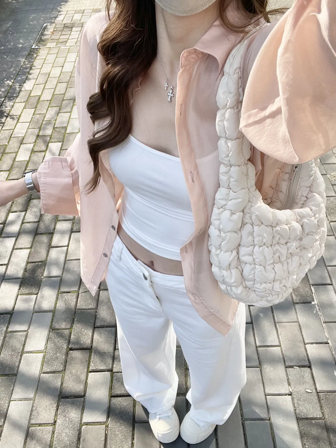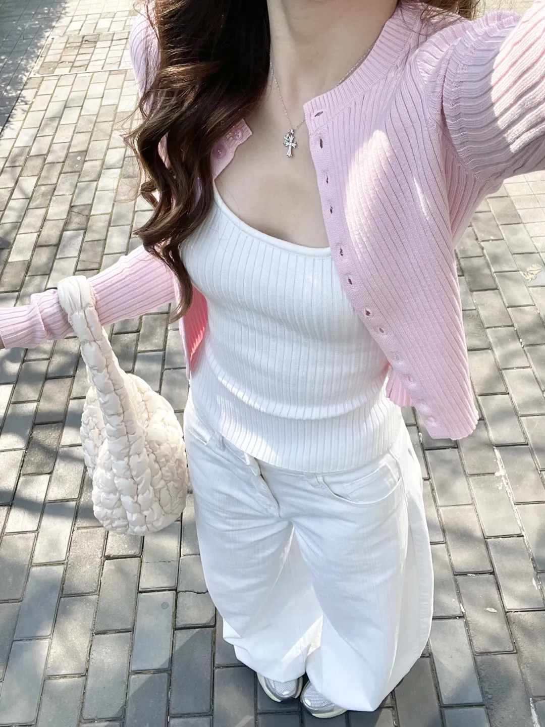 砖铺的路面上,阳光筛下斑驳的影,像给穿搭铺了层温柔滤镜。粉色针织开衫轻搭肩头,与白色阔腿裤撞出樱花般的甜;白色刺绣上衣露出腰际,藏蓝阔腿裤衬得身姿纤长;露肩T恤的领口垂着十字架项链,牛仔短裤配粉色洞洞鞋,是少女的俏皮。每一套都像春风拂过的痕迹,软乎乎地裹着早春的暖意。