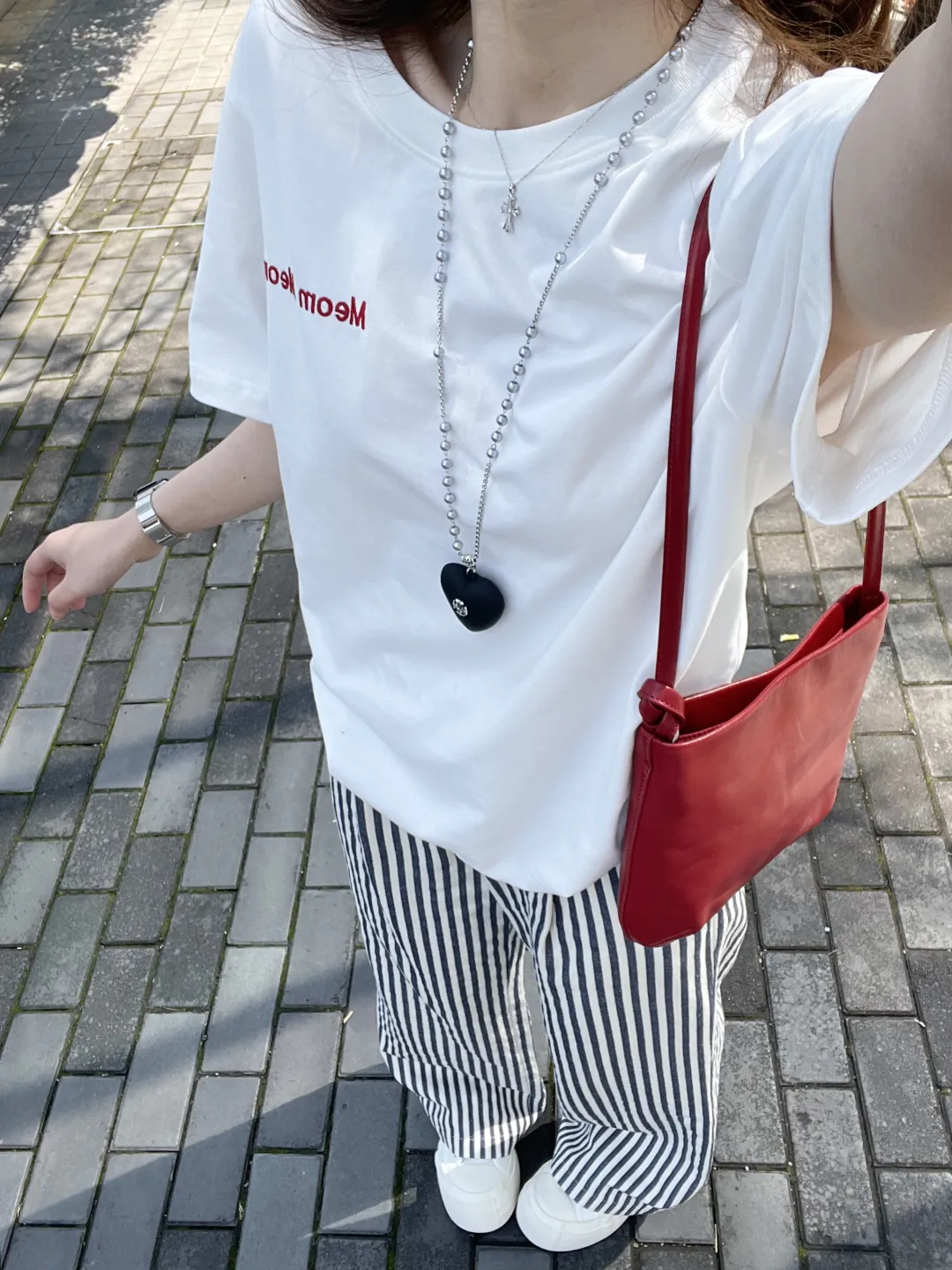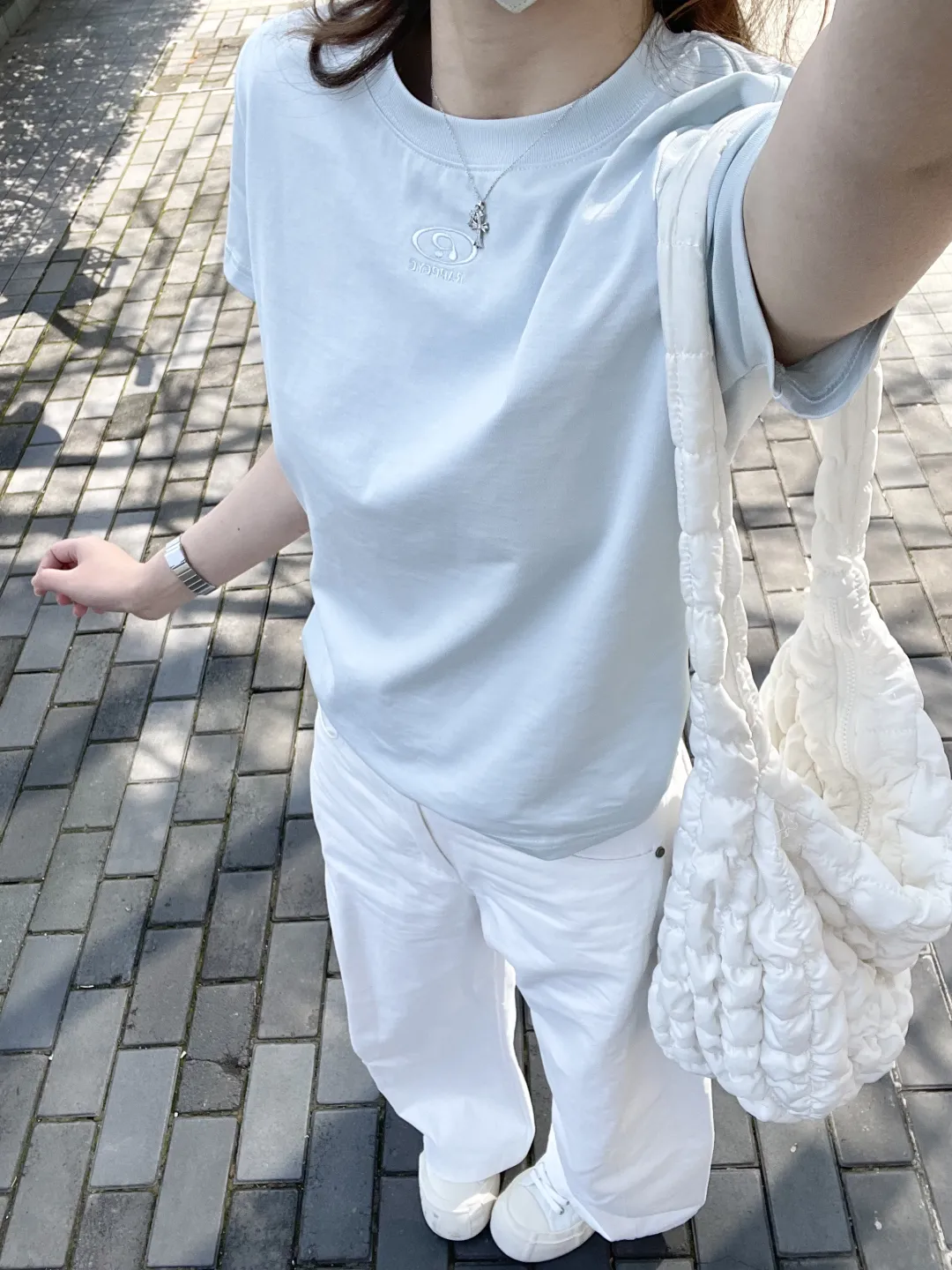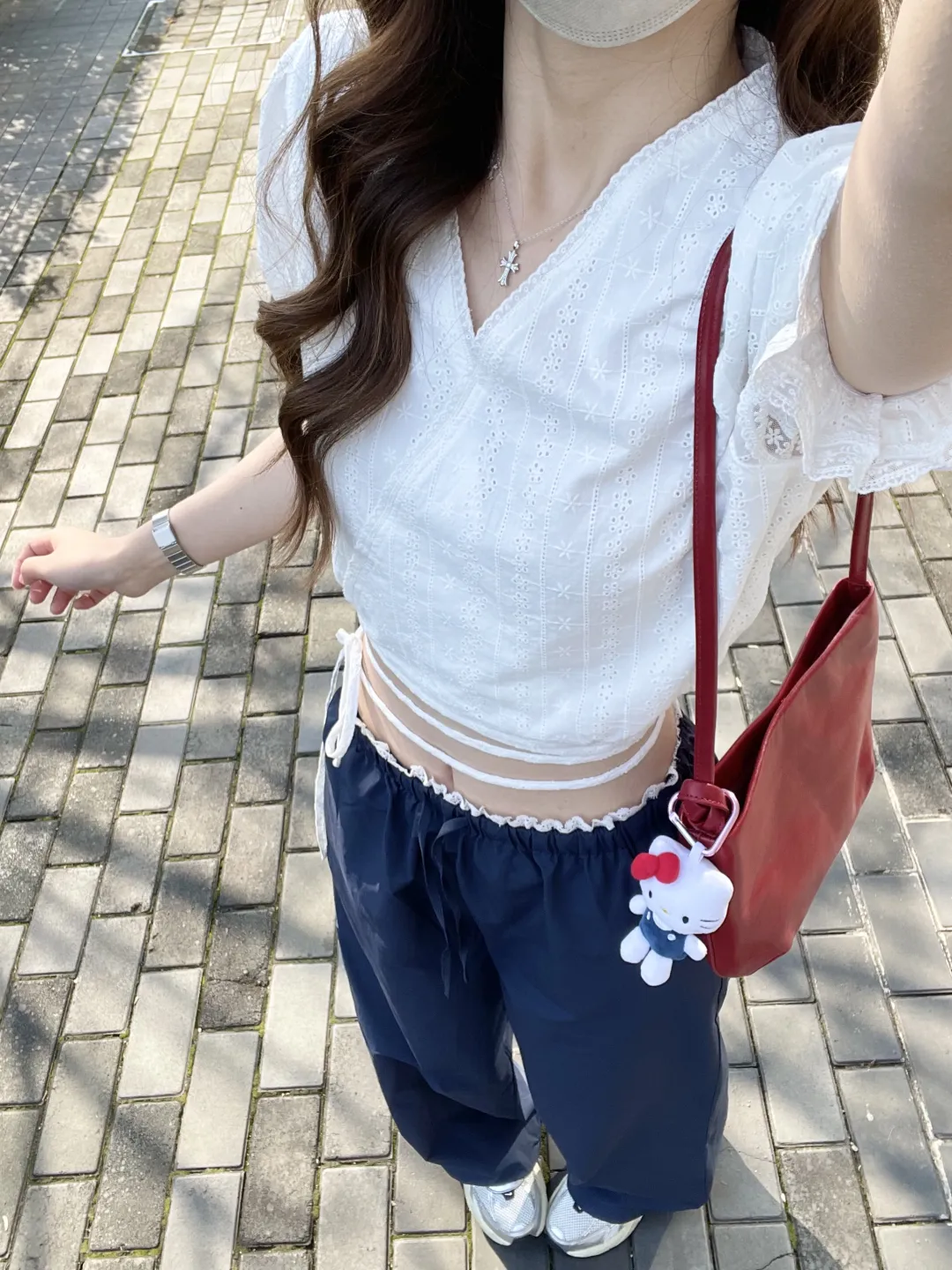 砖铺的路面上,阳光筛下斑驳的影,像给穿搭铺了层温柔滤镜。粉色针织开衫轻搭肩头,与白色阔腿裤撞出樱花般的甜;白色刺绣上衣露出腰际,藏蓝阔腿裤衬得身姿纤长;露肩T恤的领口垂着十字架项链,牛仔短裤配粉色洞洞鞋,是少女的俏皮。每一套都像春风拂过的痕迹,软乎乎地裹着早春的暖意。
